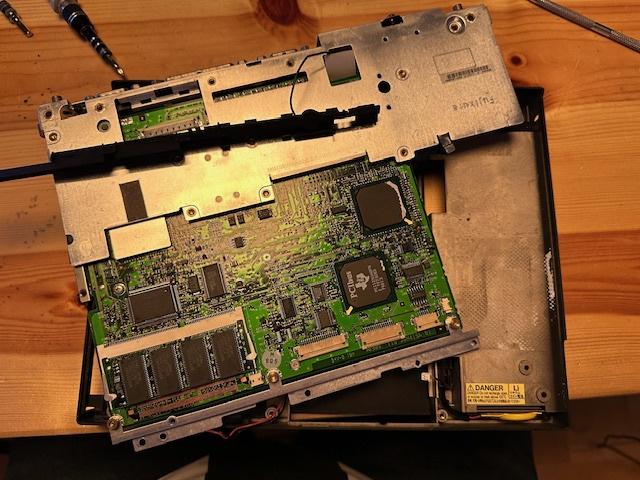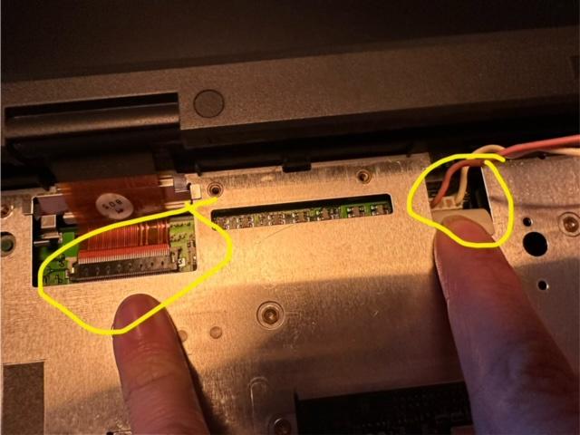 12) Slide off the display ribbon on the back/left and inverter power cable back/right – the whole lid will slide up and off the base. Park it.