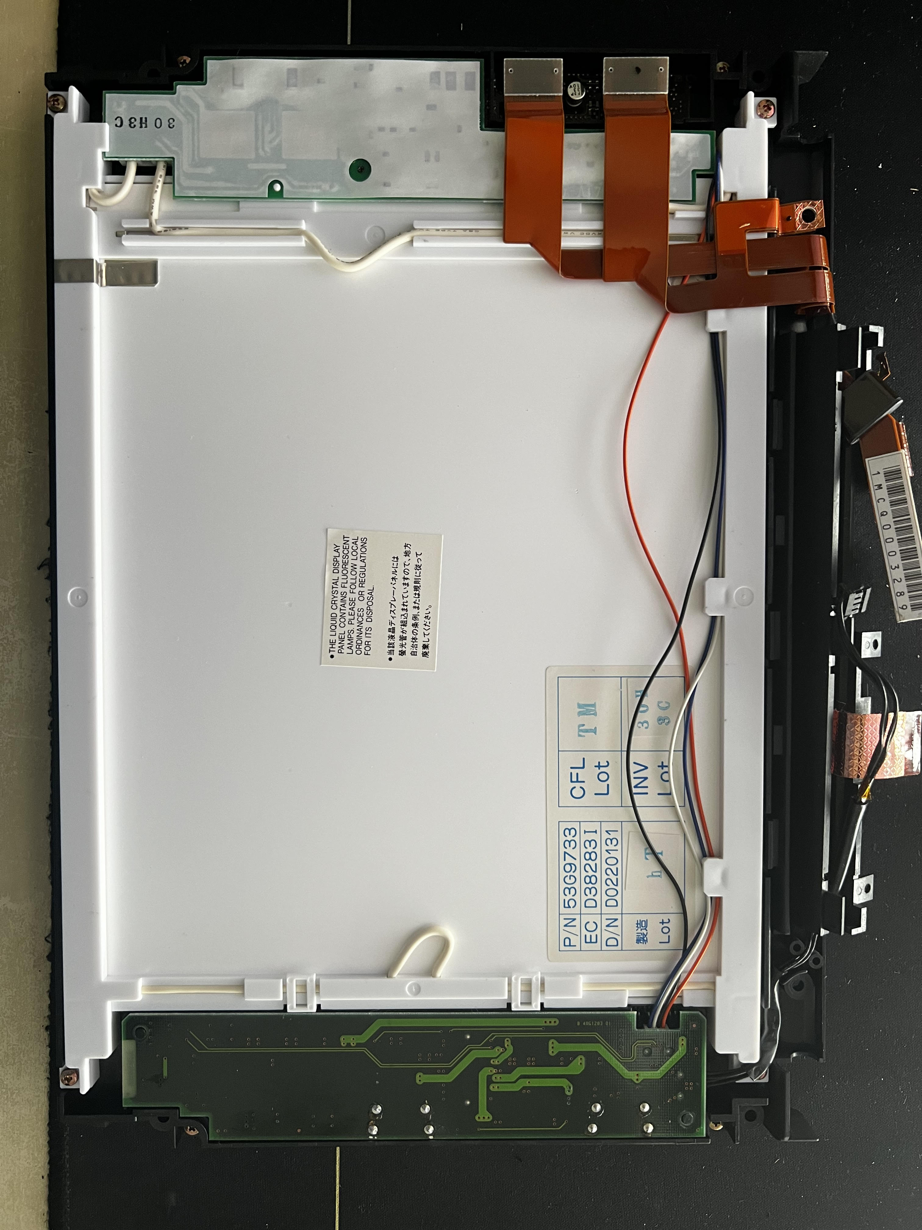 Disassembly and reassembly of the LCD is pretty straight forward, and one thing you need to be careful about is that the connector connecting inverter board PN53G9730 and the screen panel (white one on the bottom of the picture). It's tight ,and you cannot see it while removing the inverter board.