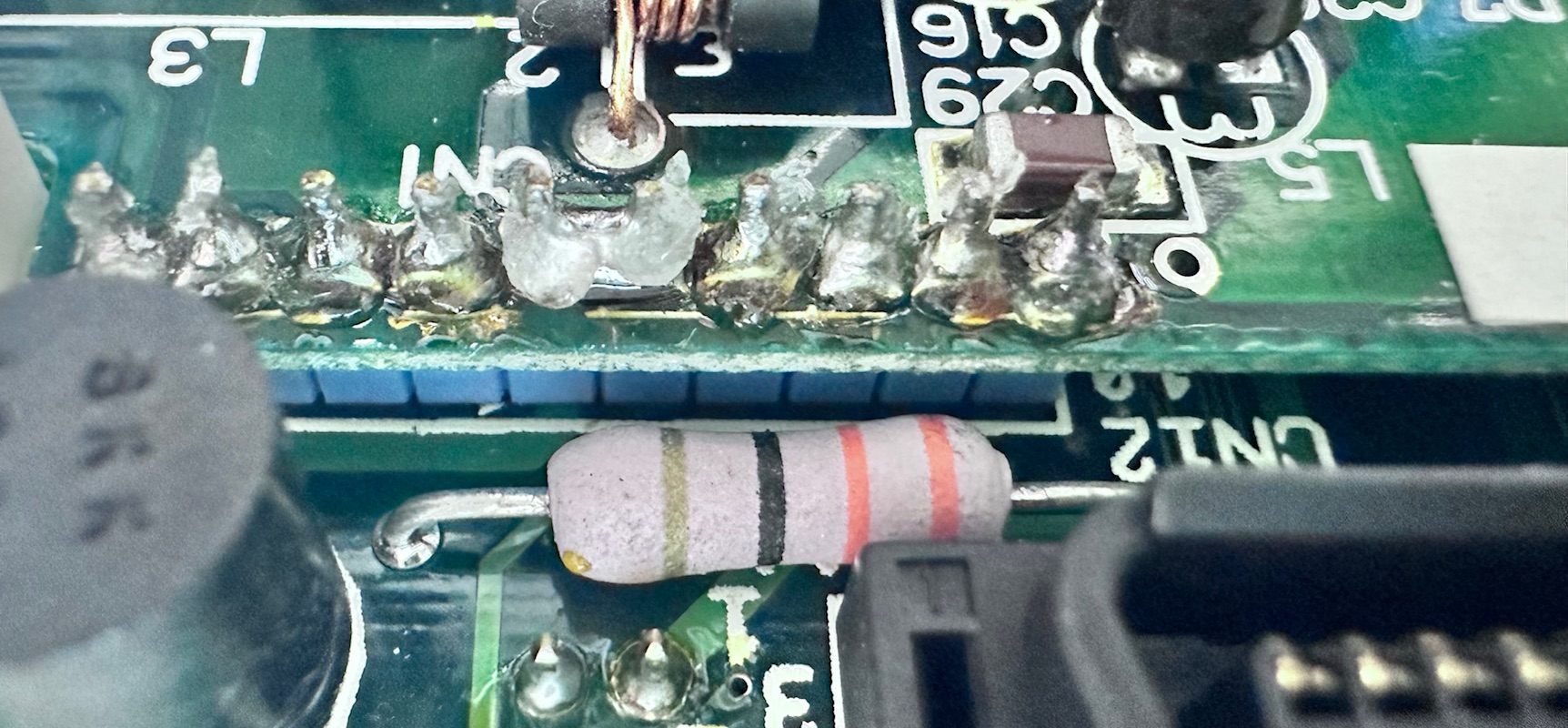 The inverter has 3 x surface mounted capacitors which are all rotten. Easily replaced with 3 ceramics. Also on the invertor is a boxed-in electrolytic measuring 6.8v. I replaced this too, because I just prefer to have no fluid caps on my machines.