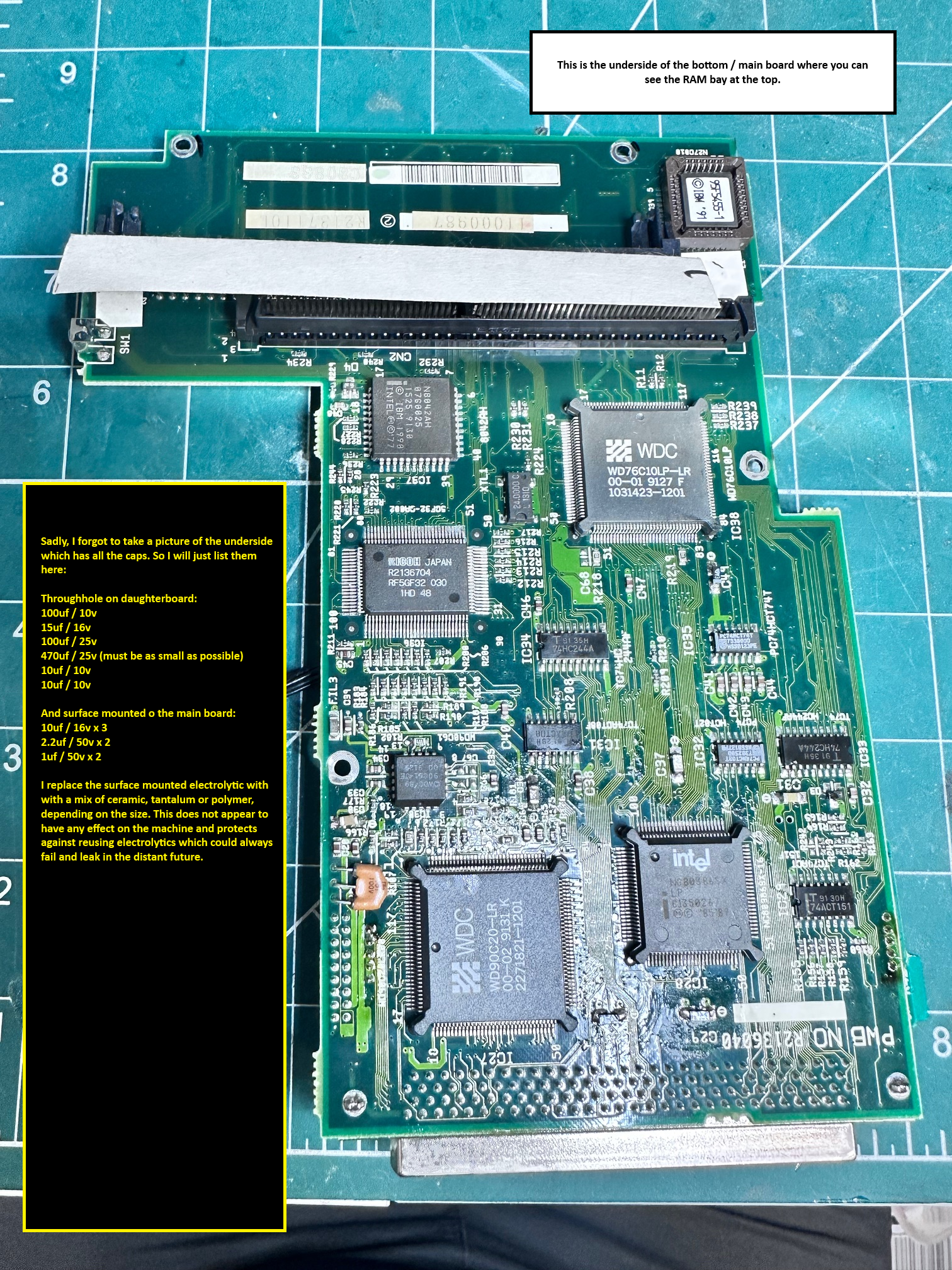 A word of warning, having done these machines many times, I easily underestimate the time it takes to disassemble these machines and recap them. Knowing how to disassemble and re-assemble the 8533 PS/2 Note like the back of my hand, I can do the teardown, complete recap and reassemble and test in 6 hours. Due to the complexity of the cabling, screws and the sheer number of boards, along with the fact you have to desolder two daughterboards along the way, I would double this for your first time. In addition you should bear in mind that due to the age and type of the original solder and the amount of cleaning involved you need practice to ensure you don't damage anything. The legs on the daughterboards are particularly hard because you have to perfectly desolder on 2 or 3 edges to get it to lift off. A combination of desoldering gun (mine is set fo 840 degrees), fresh solder mixed in with the old, lots of copper braid to soak up anything the gun can't get and sometimes additional regular solderiong iron application to get it to wiggle off it whats required.