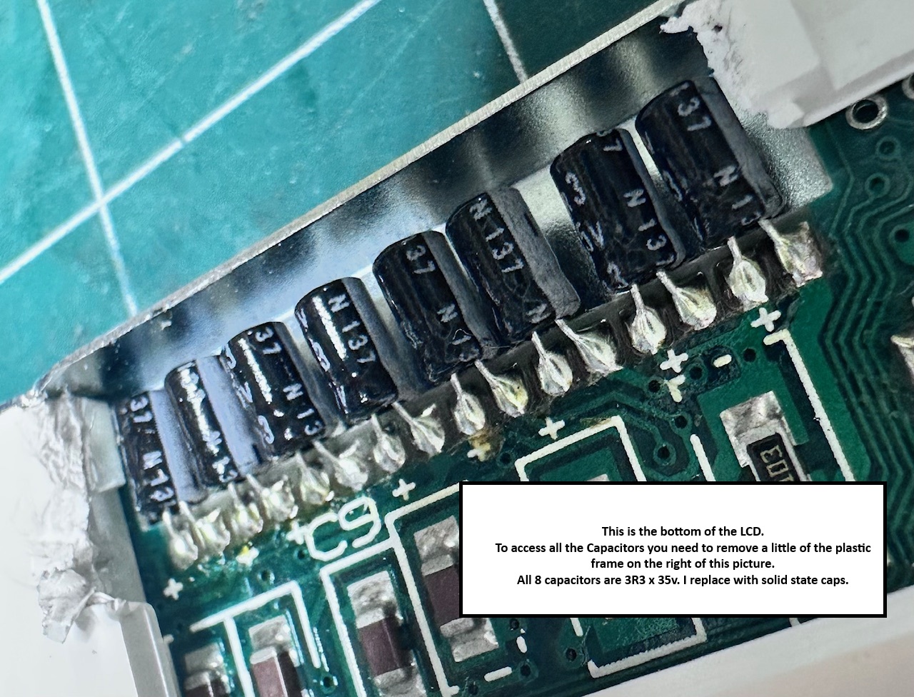 And here we have the LCD's 8 capacitors (which show no signs of failure, but I replace anyway with solid state ones (shown above)