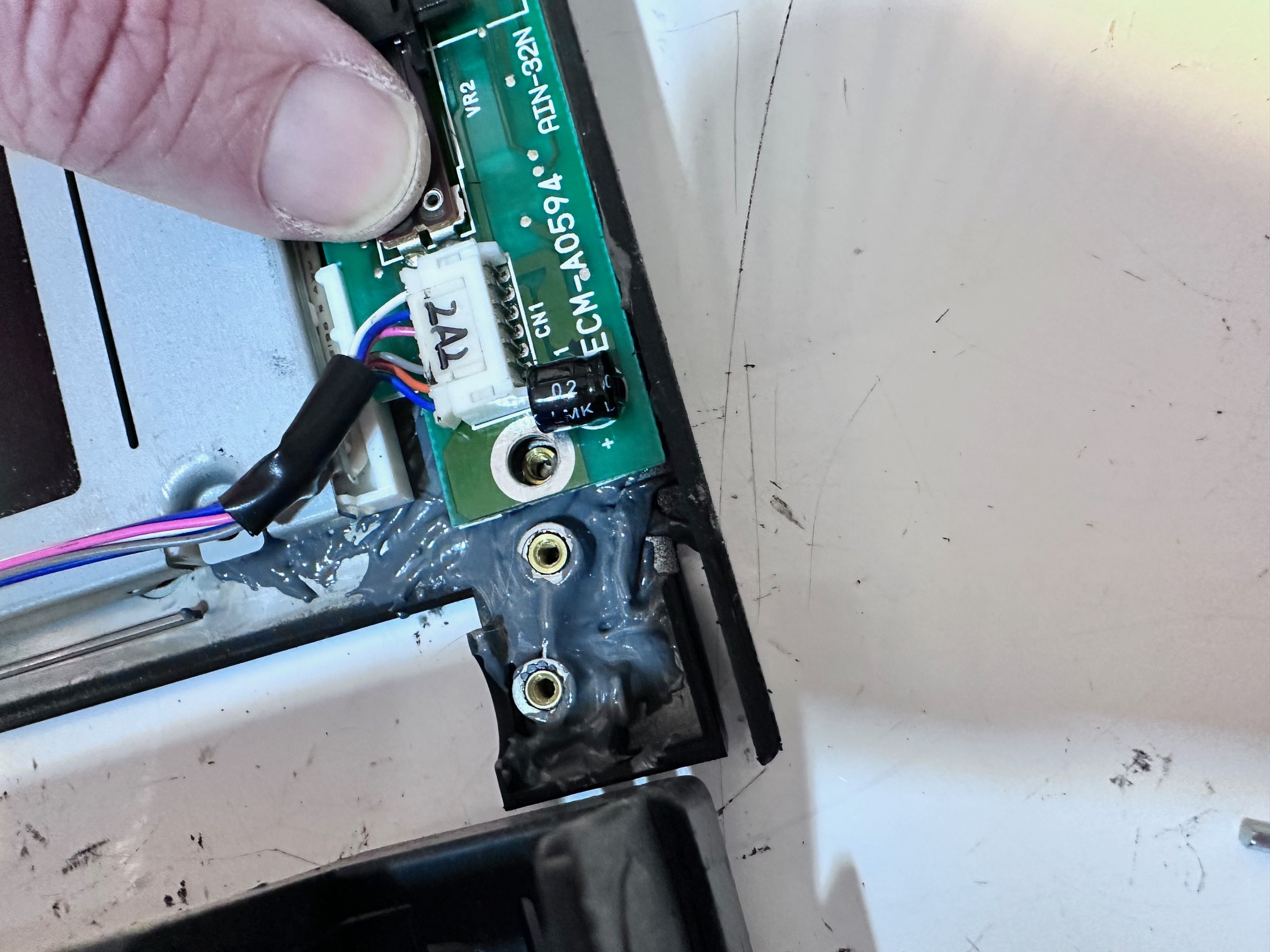 The smaller of the two-part DC board has two quite unusual aluminium electrolytic through-hole capacitors on it - 2 x 1.5uf 25v. These are virtually possible to find now in electrolytic and someone suggested they're just used for some kind of smoothing, so I replaced them with the closest I had - 1uf / 50v ones and the machine ran for a few hours without any issues. **Note you can actually get 1.5uf through-hole elecrolytics now from RSonline for cheap.