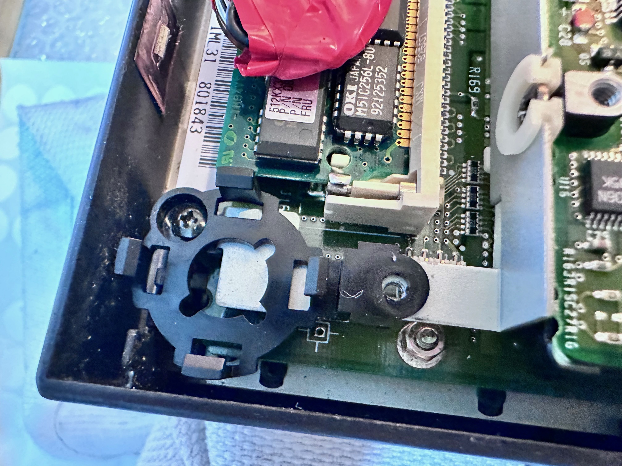 The backup battery is on a fairly standard 2032 coin cell, and you mount it to this tiny plastic holder which goes to the side of the RAM slot. One side screws onto the HDD mounting metal and the other directly into the motherboard: