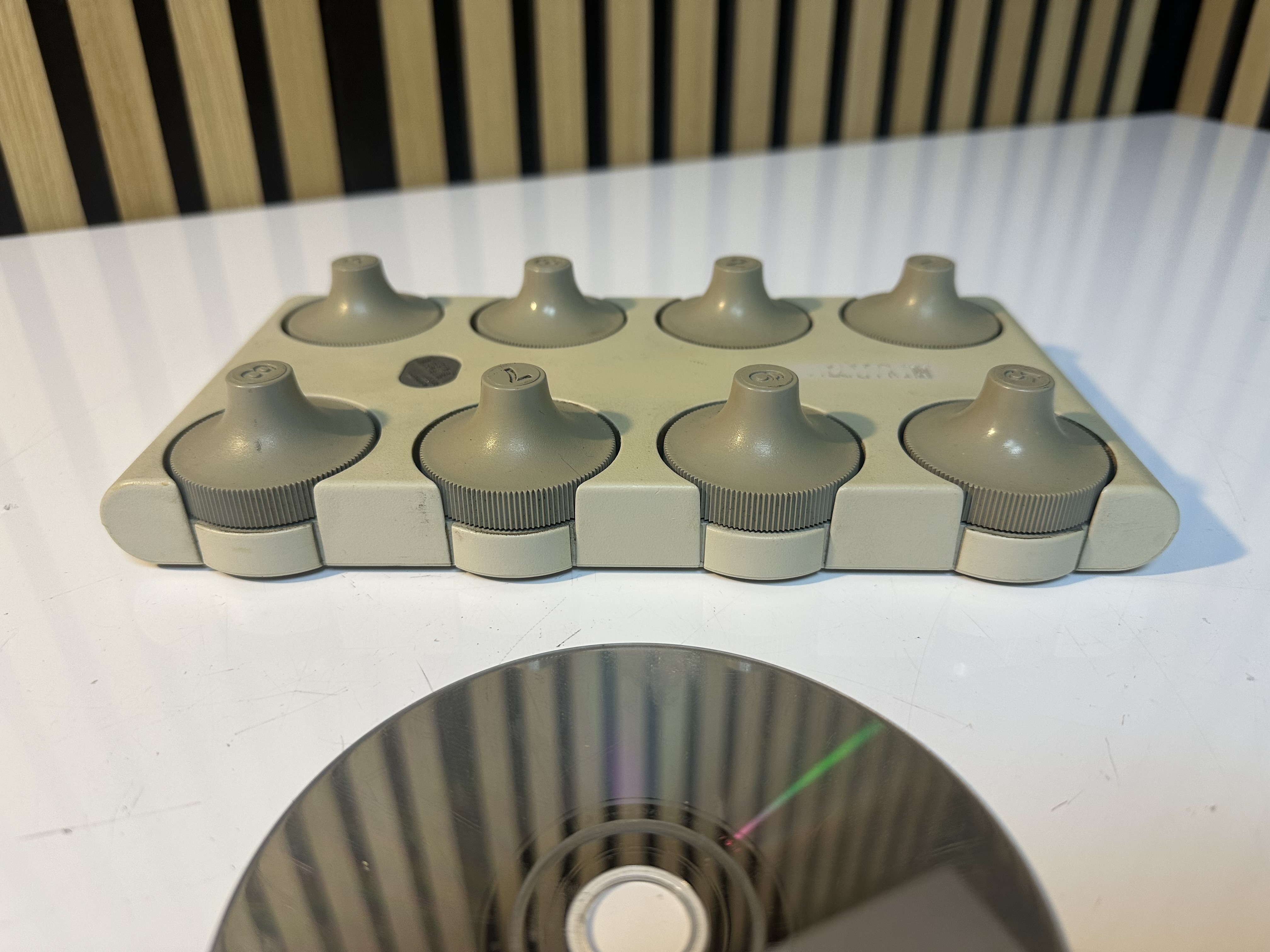 Well it was IBM Dials, used as a bunch of 8 configurable rotation wheels which could be used to manage CAD workstations. Each one could be assigned a function like roll, rotate, zoom, pan, tilt and so on. It was programmable by the software which was running on the machine and the dials don't have any labels, so really the 8 dials can do whatever the software is programmed to make them do!