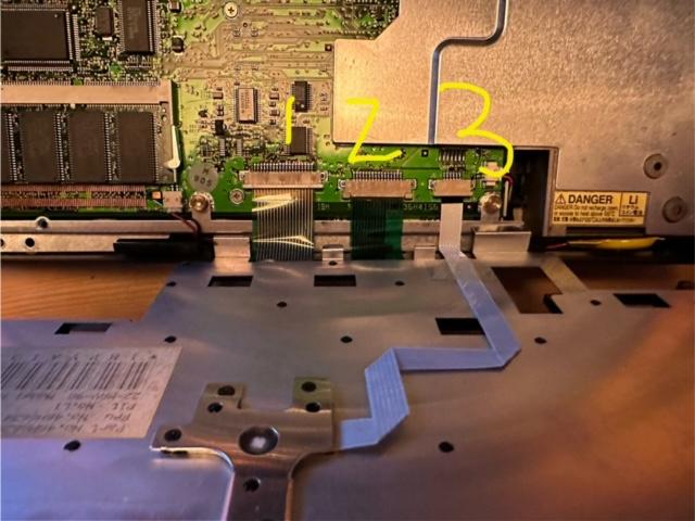 12) Slide off the display ribbon on the back/left and inverter power cable back/right – the whole lid will slide up and off the base. Park it.