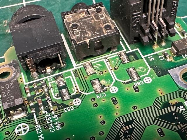 27) The audio daughterboard has 3 surface mount caps that might leak one day
