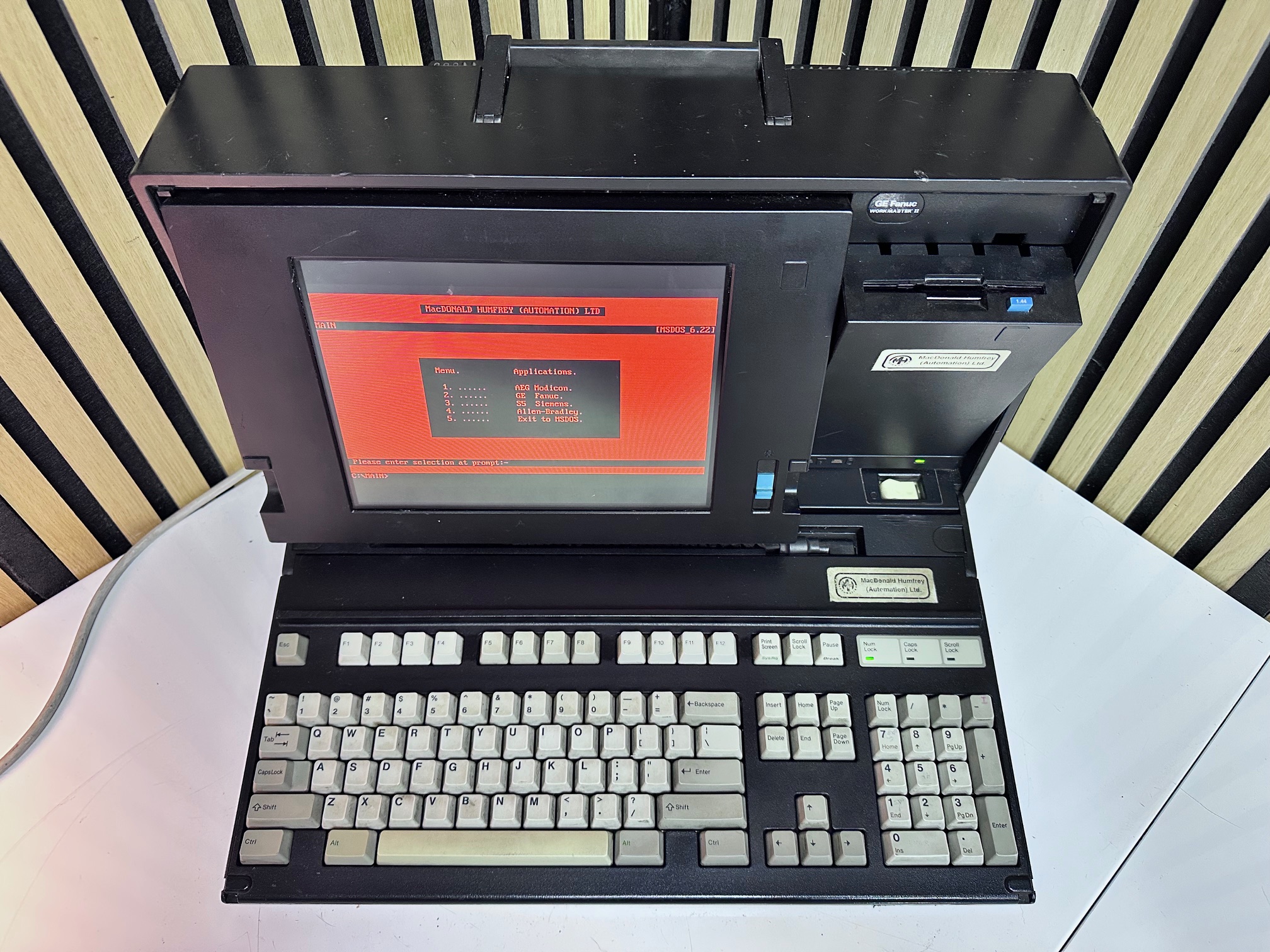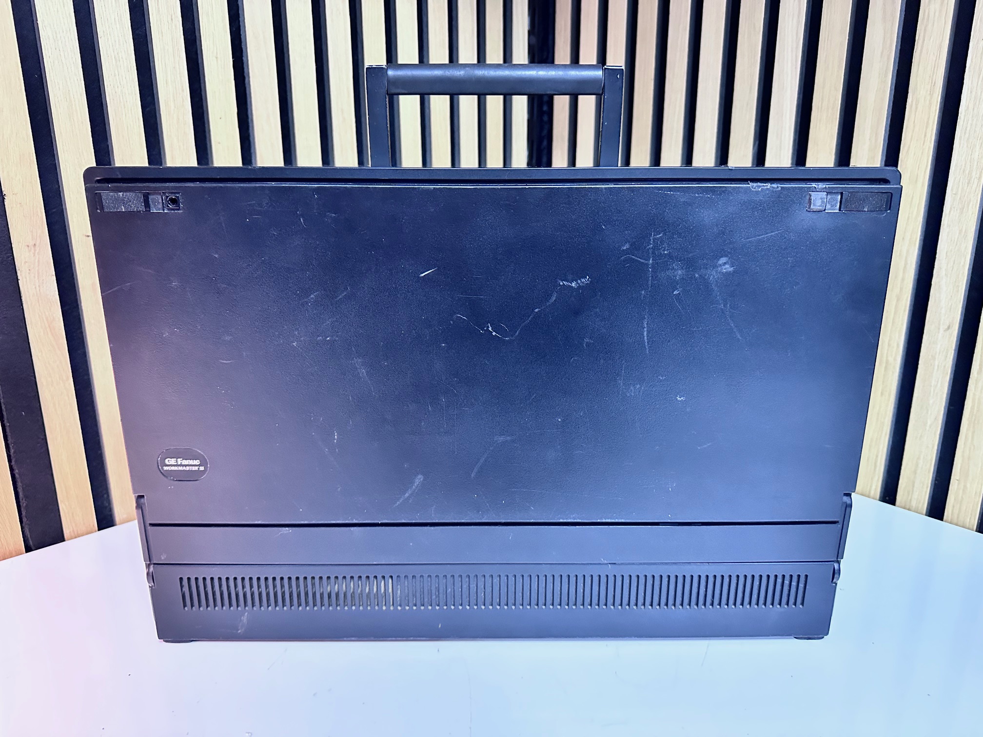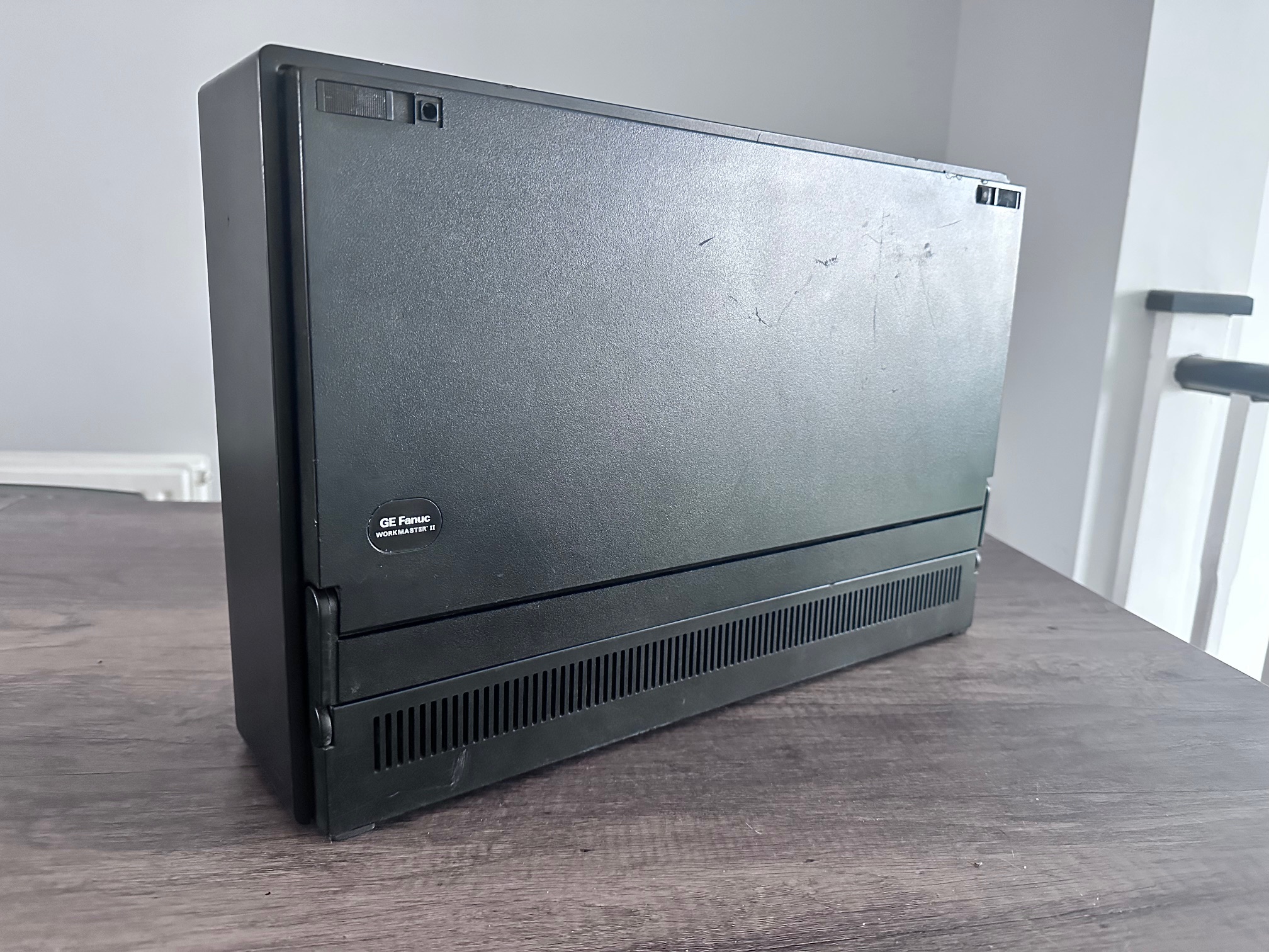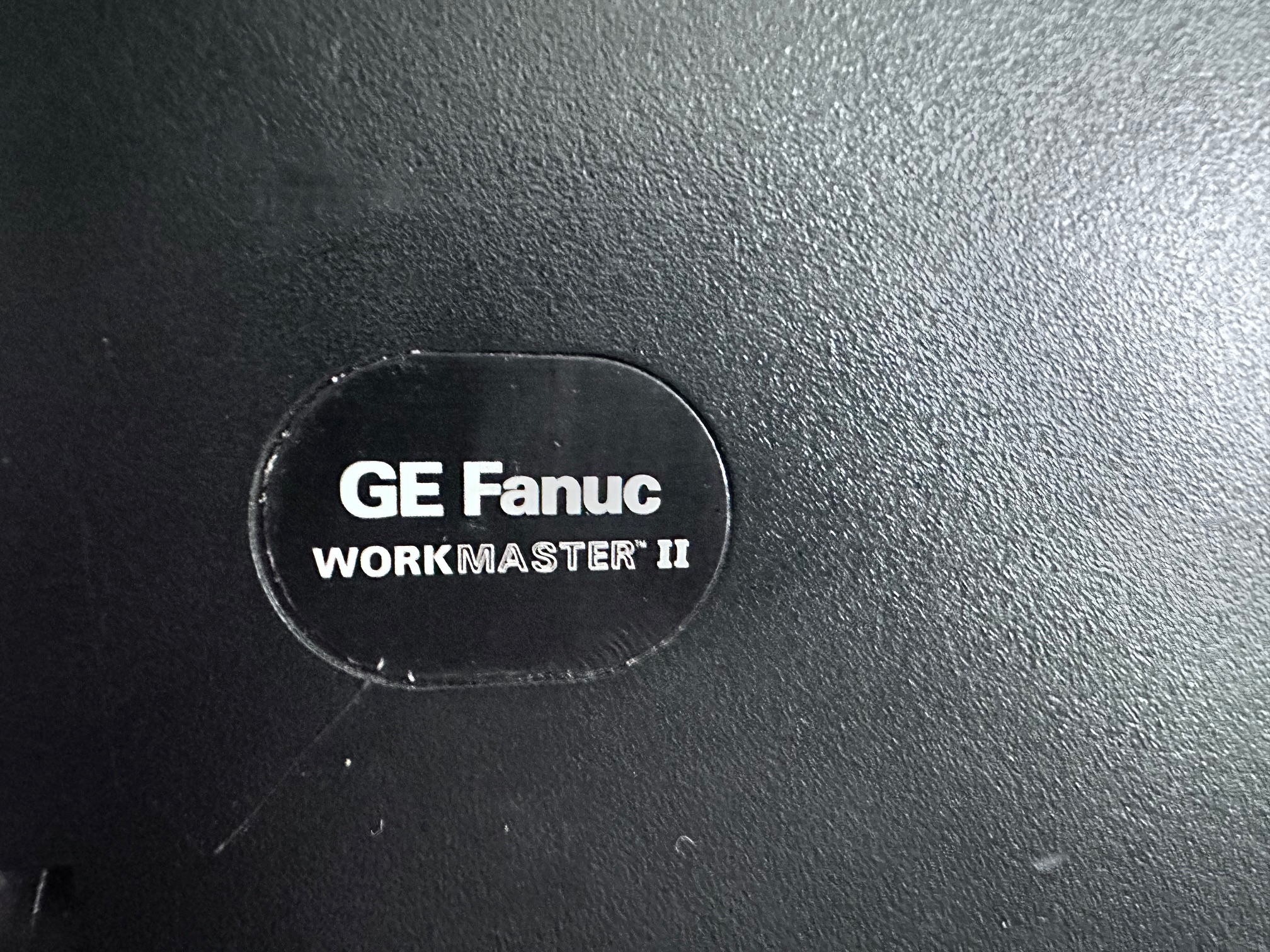 First came GE's Program Development Terminal which was a huge, ancient proprietary computer built into a desk. The PDT tipped the scales at 45kg. The PDT was superceded by the Workmaster I, which was a black modified IBM 5155 CRT-equipped Portable (or Sewing Machine) computer. The Workmaster I was introduced around 1986 as a DOS-based programming tool for GE Fanuc Programmable Controllers. Prior to that, you needed a dedicated prgrammer. GE was among the first to introduce software for PLCs that could run under DOS. The Workmaster 1 had a unique keyboard specific to GE, but the Workmaster II simply has a standard P70 keyboard, albeit encased in black moulded plastic. There was no Workmaster III as GE developed software which most IBM/PC-compatible machines would support and carried data over standard RS-232 serial.