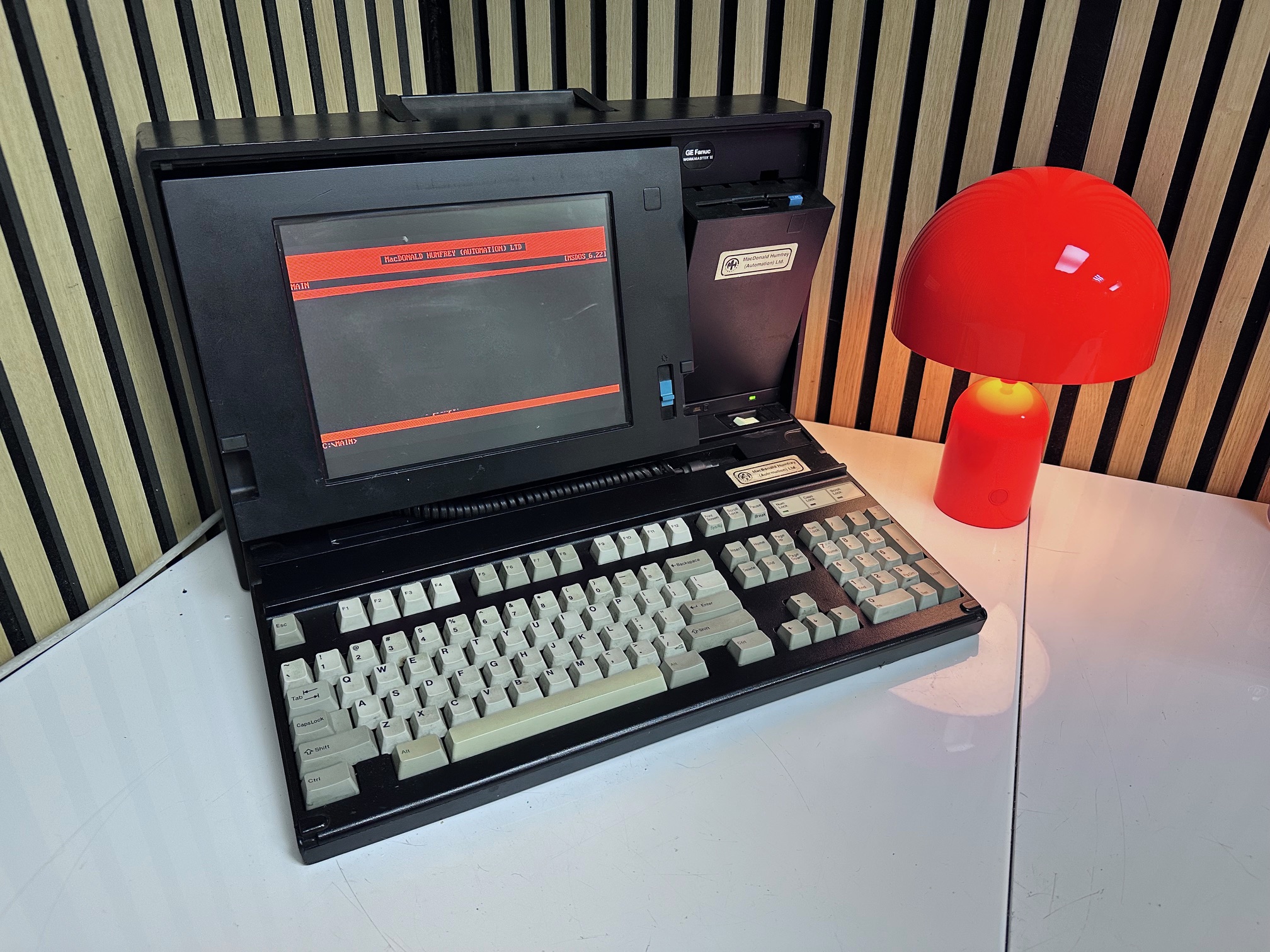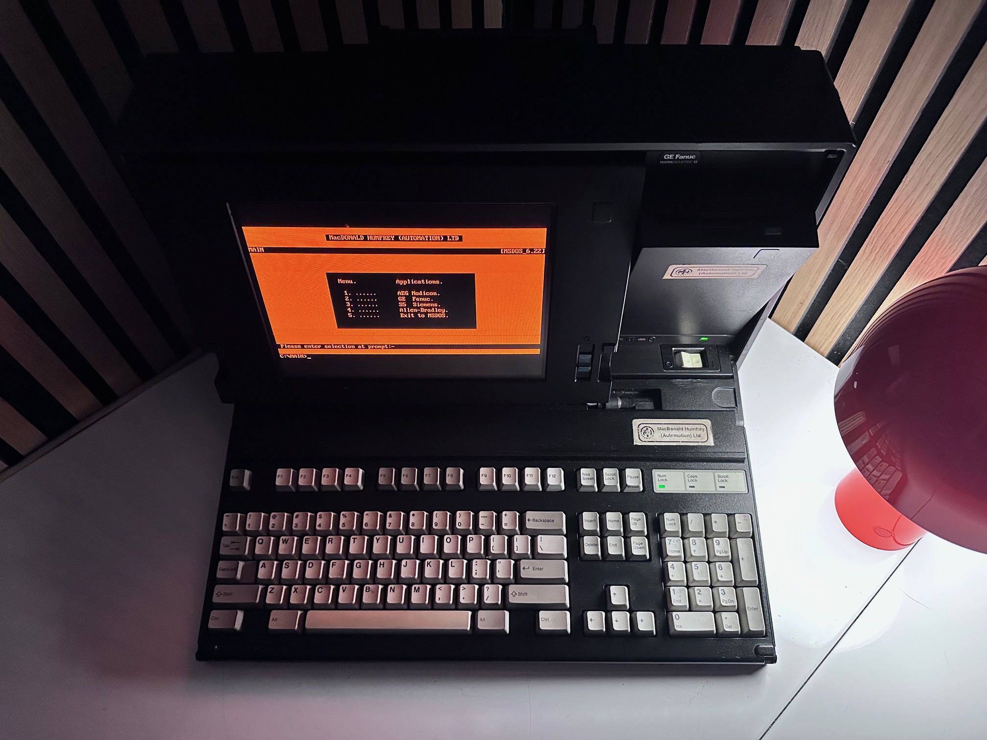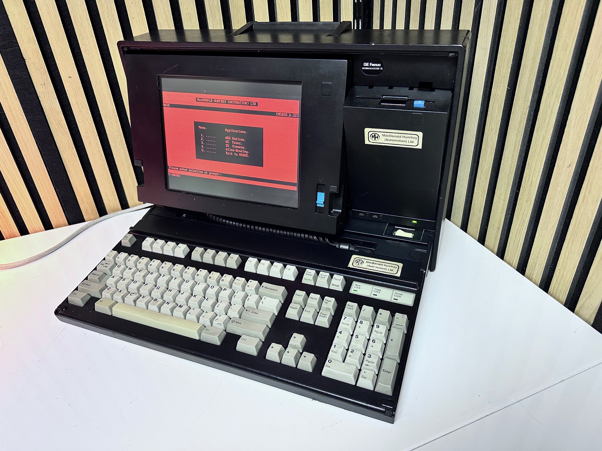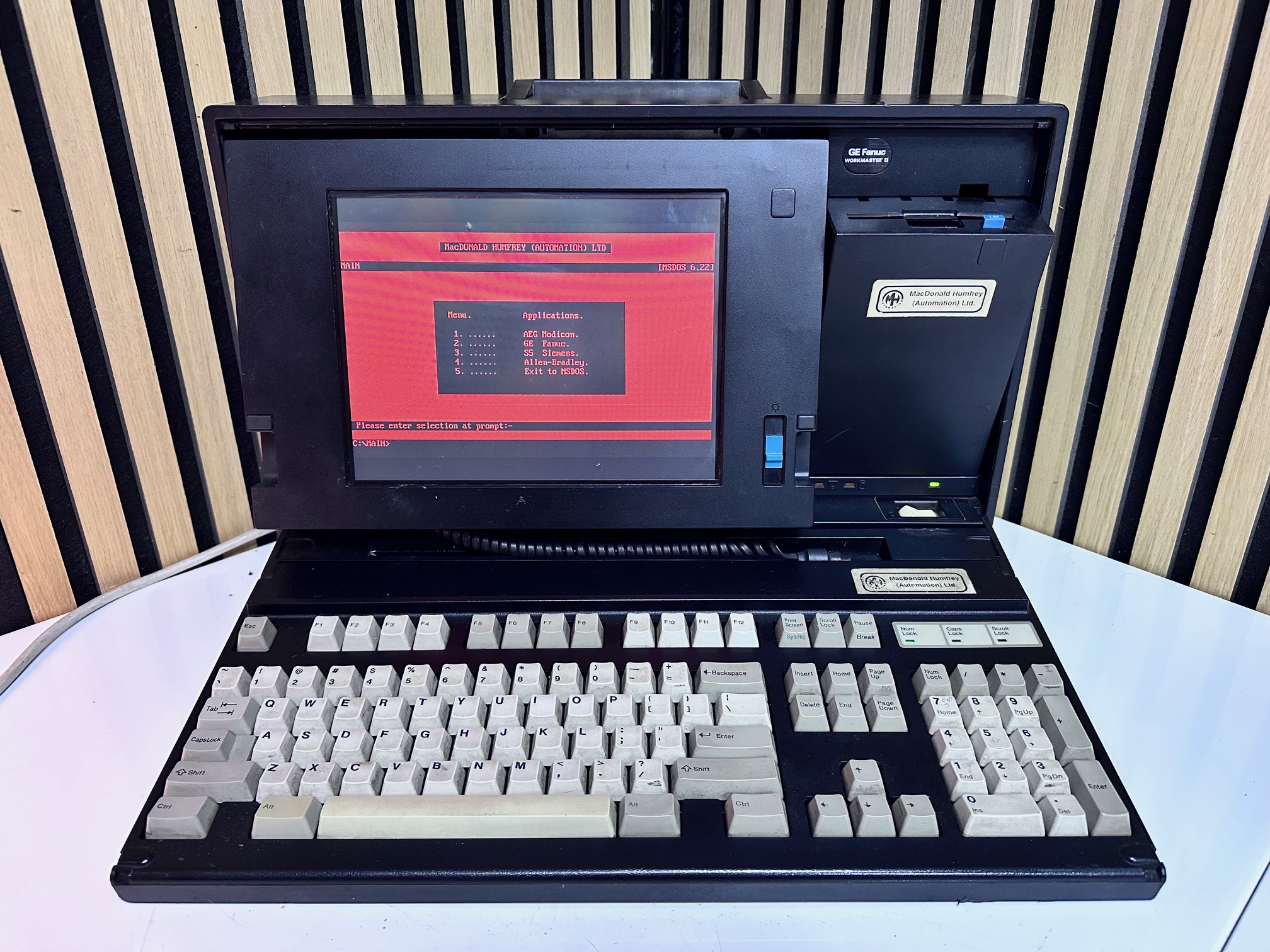 First came GE's Program Development Terminal which was a huge, ancient proprietary computer built into a desk. The PDT tipped the scales at 45kg. The PDT was superceded by the Workmaster I, which was a black modified IBM 5155 CRT-equipped Portable (or Sewing Machine) computer. The Workmaster I was introduced around 1986 as a DOS-based programming tool for GE Fanuc Programmable Controllers. Prior to that, you needed a dedicated prgrammer. GE was among the first to introduce software for PLCs that could run under DOS. The Workmaster 1 had a unique keyboard specific to GE, but the Workmaster II simply has a standard P70 keyboard, albeit encased in black moulded plastic. There was no Workmaster III as GE developed software which most IBM/PC-compatible machines would support and carried data over standard RS-232 serial.