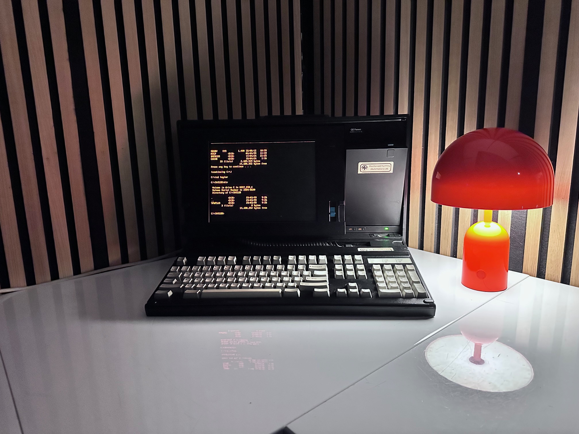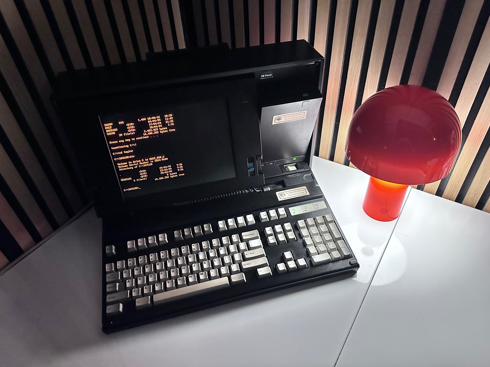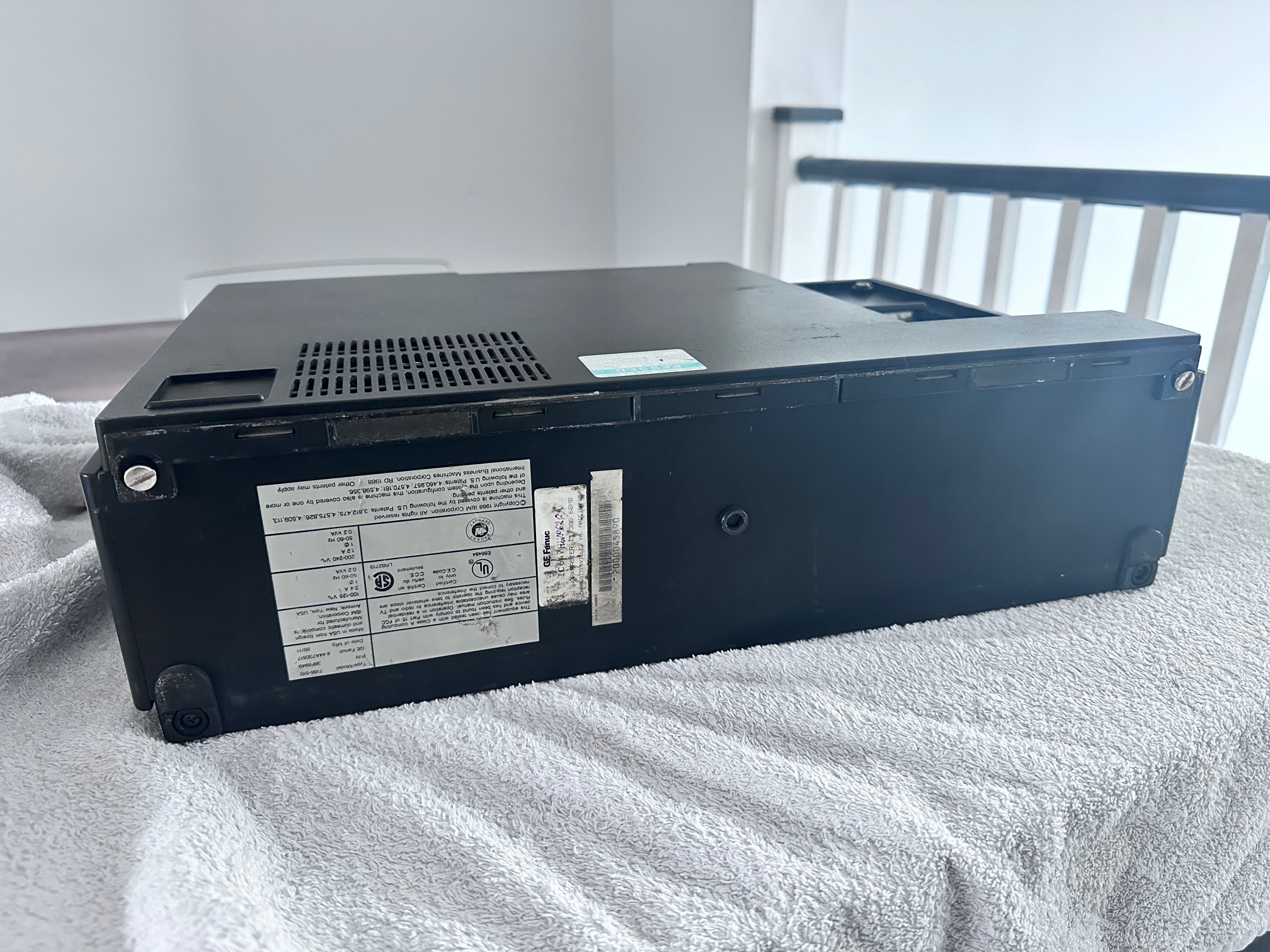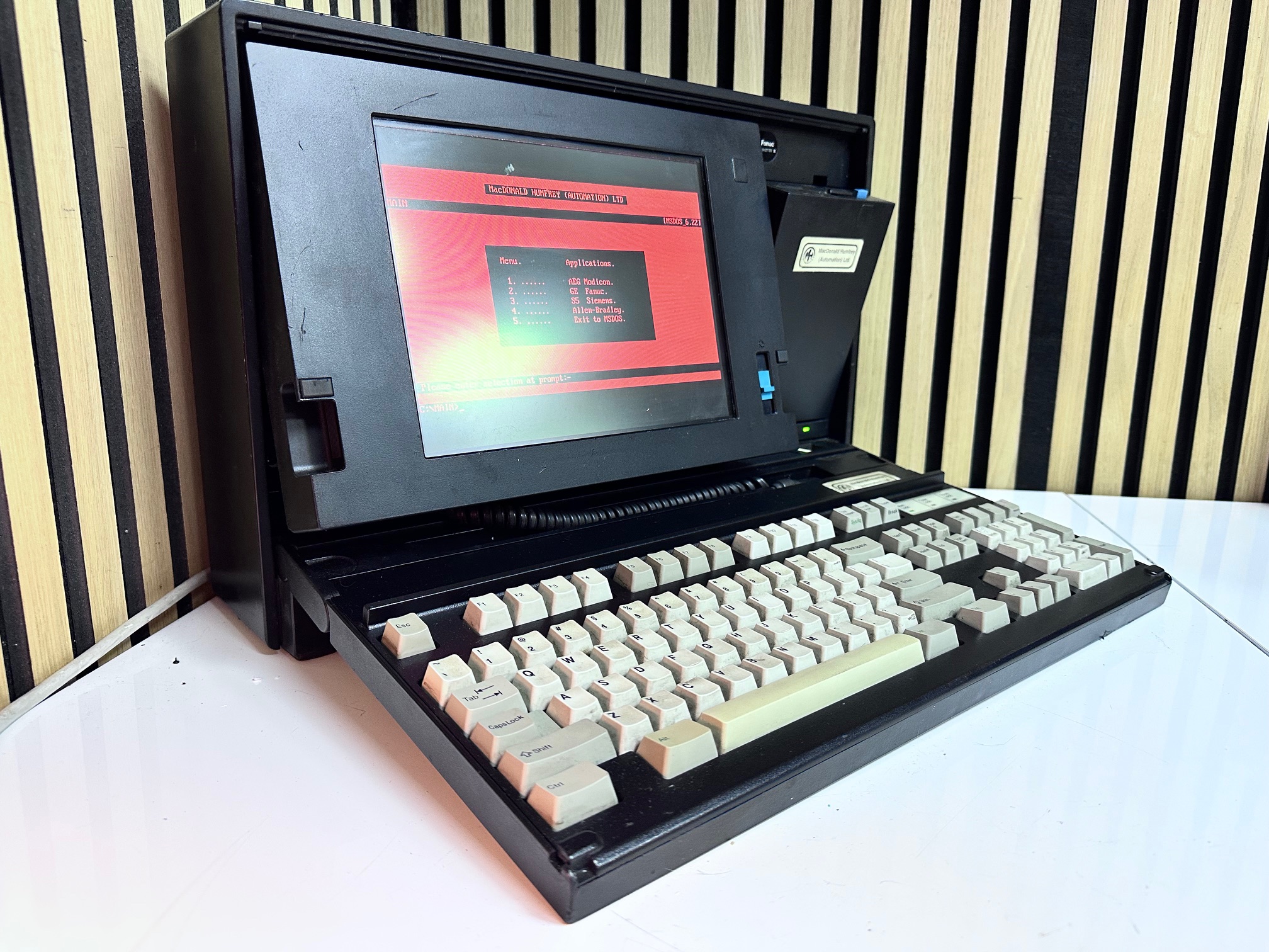 First came GE's Program Development Terminal which was a huge, ancient proprietary computer built into a desk. The PDT tipped the scales at 45kg. The PDT was superceded by the Workmaster I, which was a black modified IBM 5155 CRT-equipped Portable (or Sewing Machine) computer. The Workmaster I was introduced around 1986 as a DOS-based programming tool for GE Fanuc Programmable Controllers. Prior to that, you needed a dedicated prgrammer. GE was among the first to introduce software for PLCs that could run under DOS. The Workmaster 1 had a unique keyboard specific to GE, but the Workmaster II simply has a standard P70 keyboard, albeit encased in black moulded plastic. There was no Workmaster III as GE developed software which most IBM/PC-compatible machines would support and carried data over standard RS-232 serial.