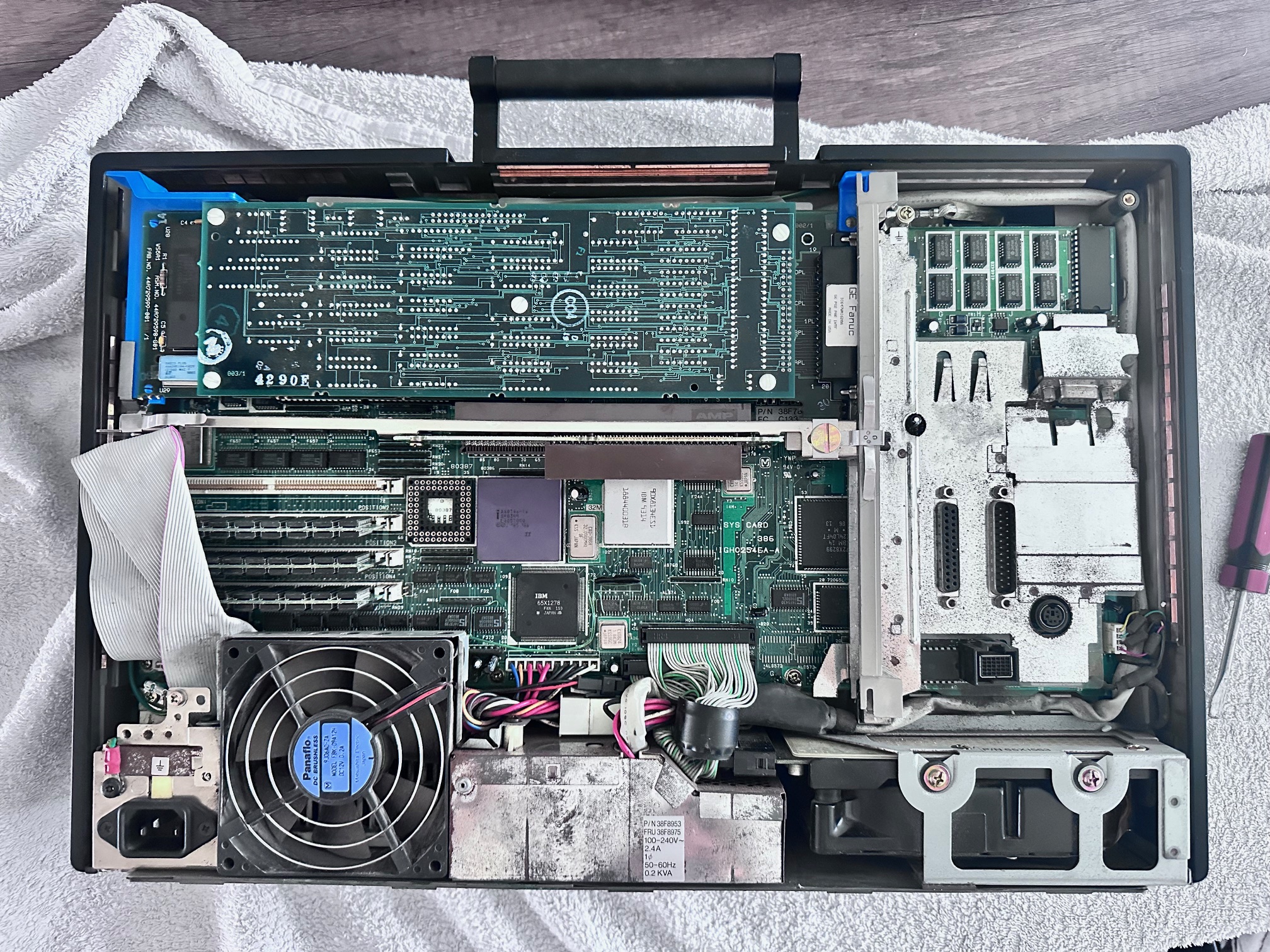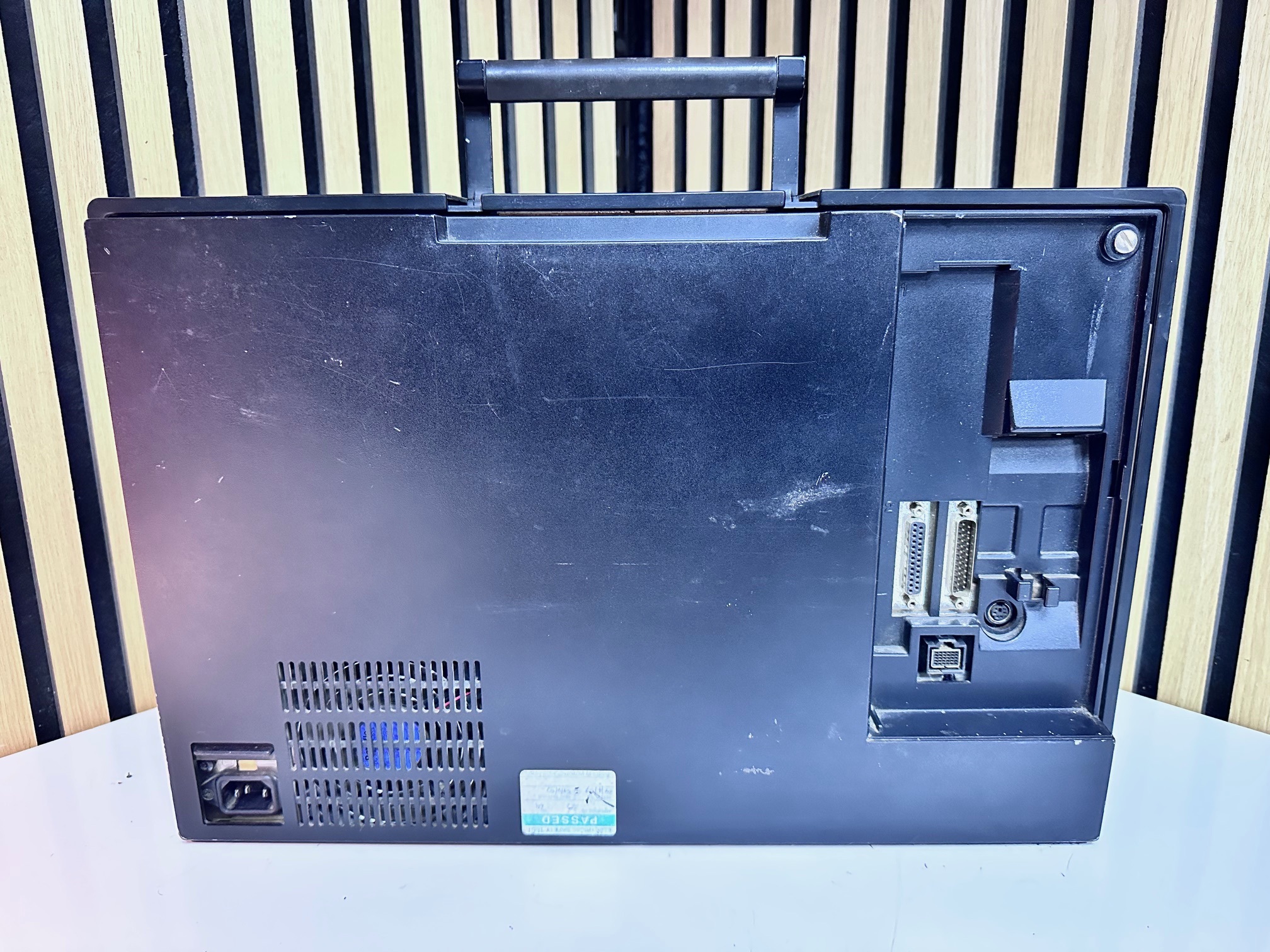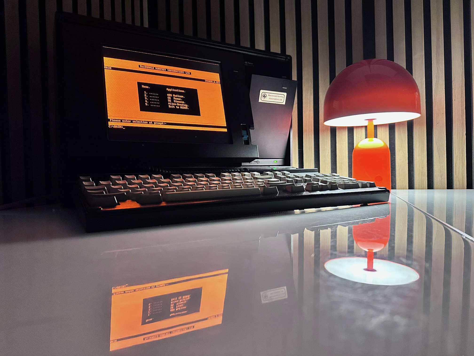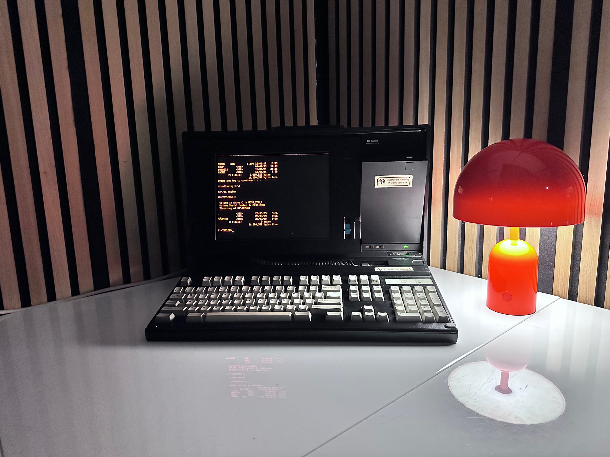 First came GE's Program Development Terminal which was a huge, ancient proprietary computer built into a desk. The PDT tipped the scales at 45kg. The PDT was superceded by the Workmaster I, which was a black modified IBM 5155 CRT-equipped Portable (or Sewing Machine) computer. The Workmaster I was introduced around 1986 as a DOS-based programming tool for GE Fanuc Programmable Controllers. Prior to that, you needed a dedicated prgrammer. GE was among the first to introduce software for PLCs that could run under DOS. The Workmaster 1 had a unique keyboard specific to GE, but the Workmaster II simply has a standard P70 keyboard, albeit encased in black moulded plastic. There was no Workmaster III as GE developed software which most IBM/PC-compatible machines would support and carried data over standard RS-232 serial.