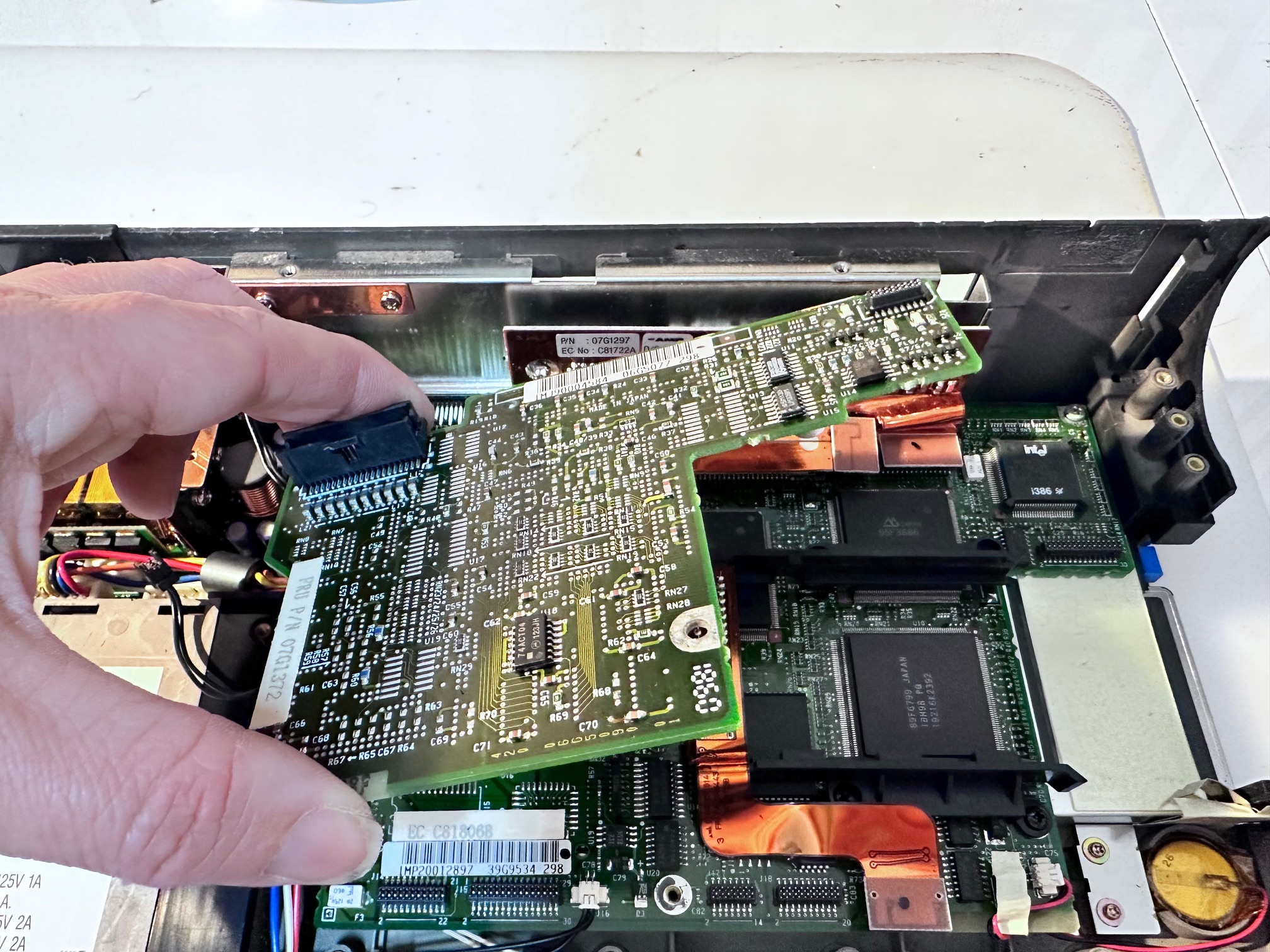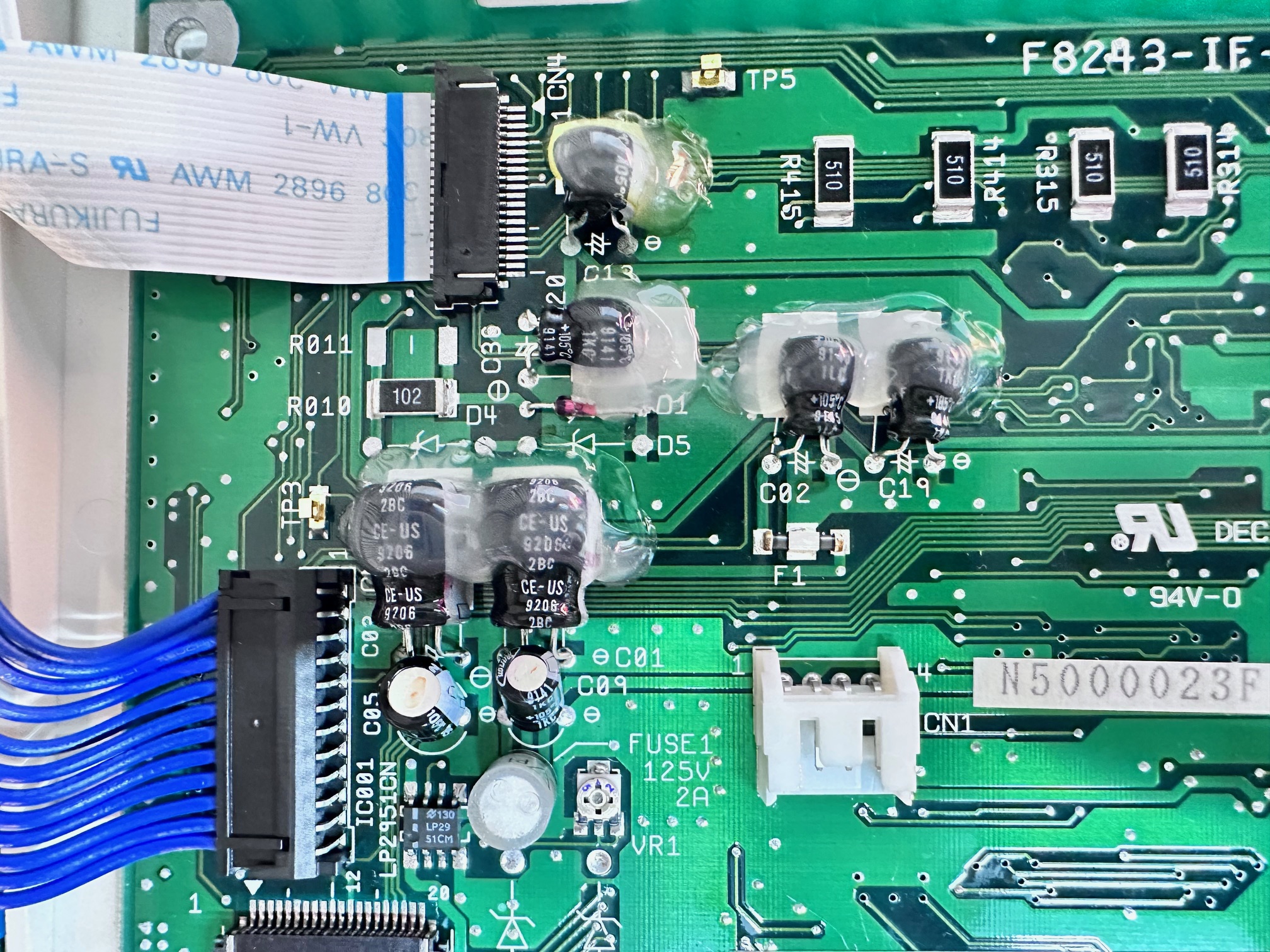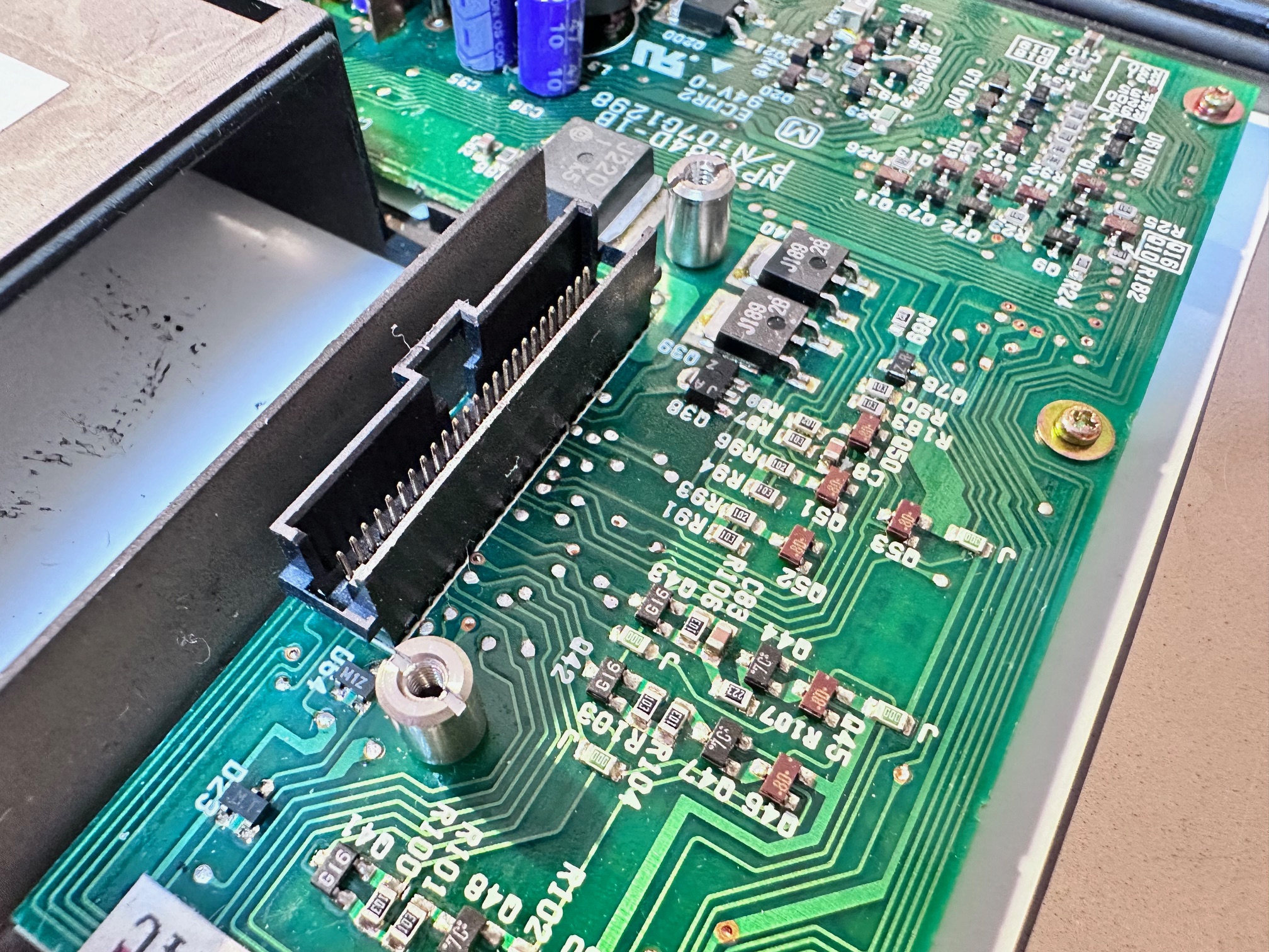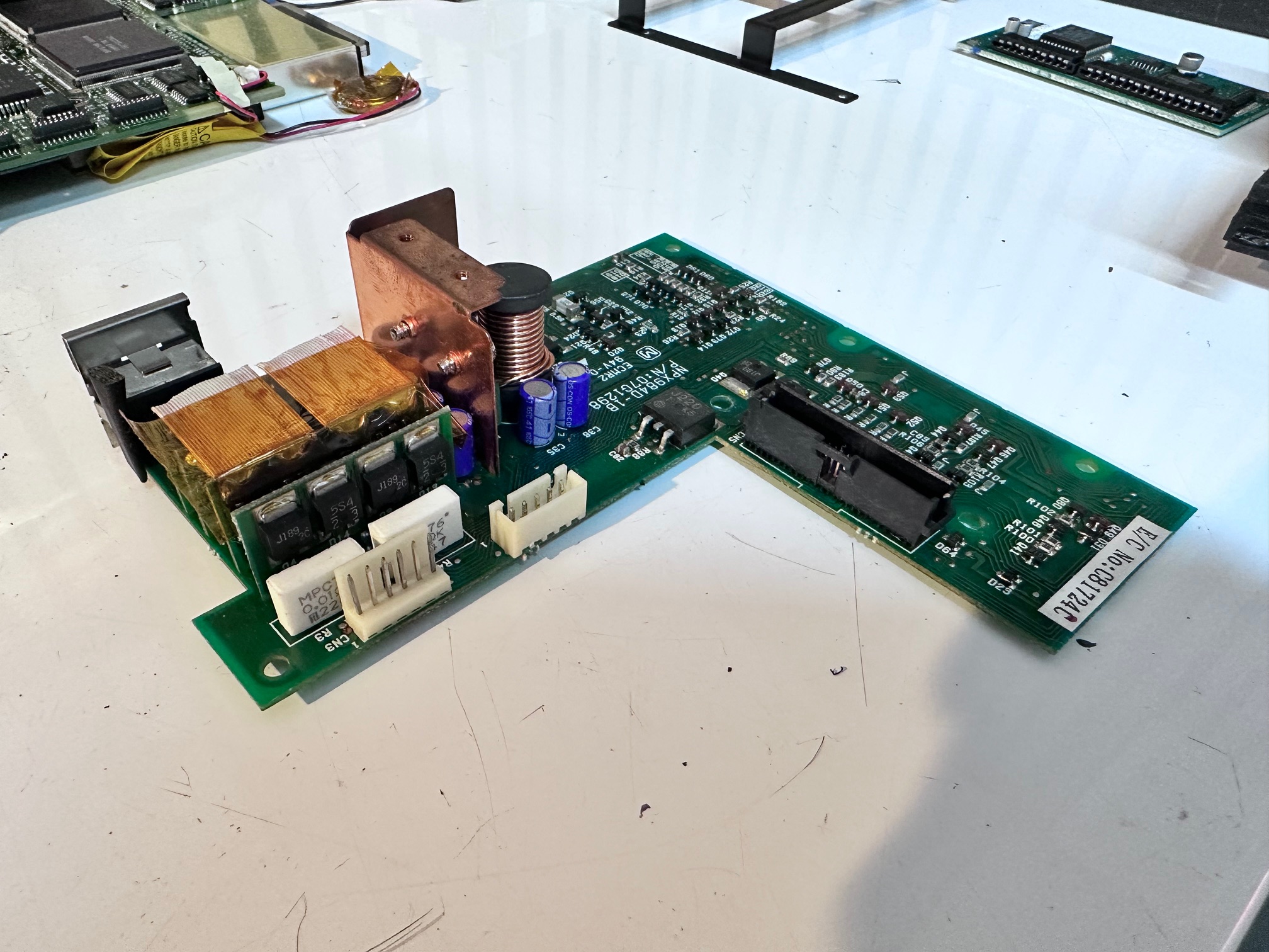 There are two power-related boards - this one at the very bottom has the power connector onboard and as you can see has a bunch of through-hole electrolytic caps to replace: