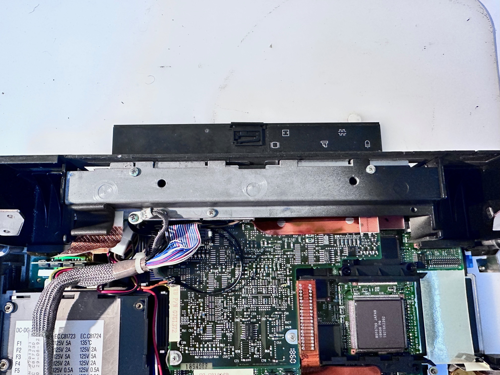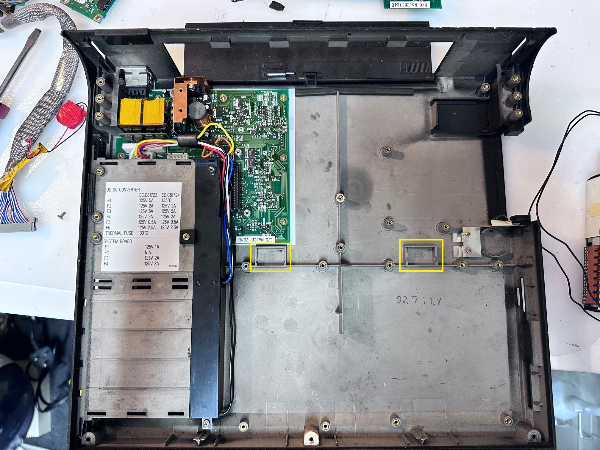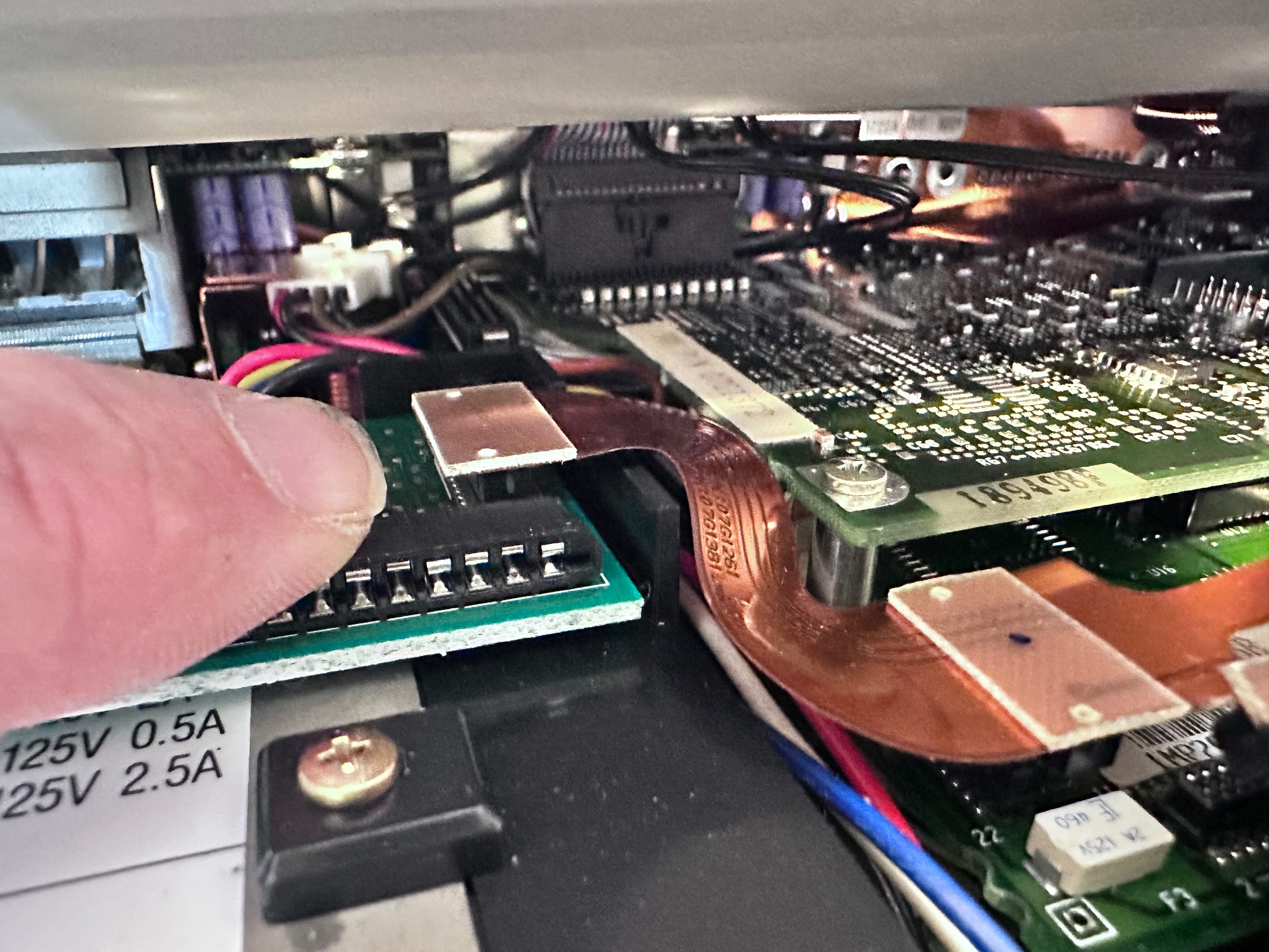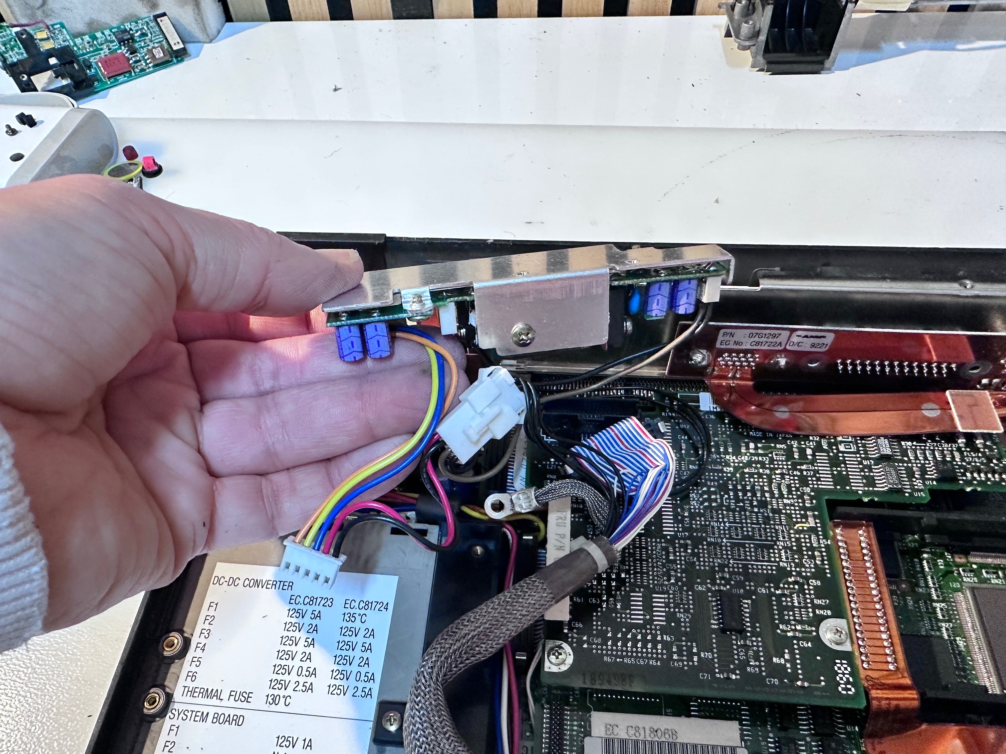 There are two power-related boards - this one at the very bottom has the power connector onboard and as you can see has a bunch of through-hole electrolytic caps to replace: