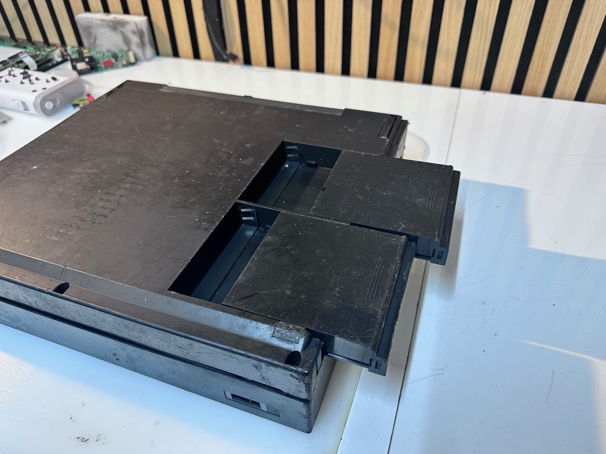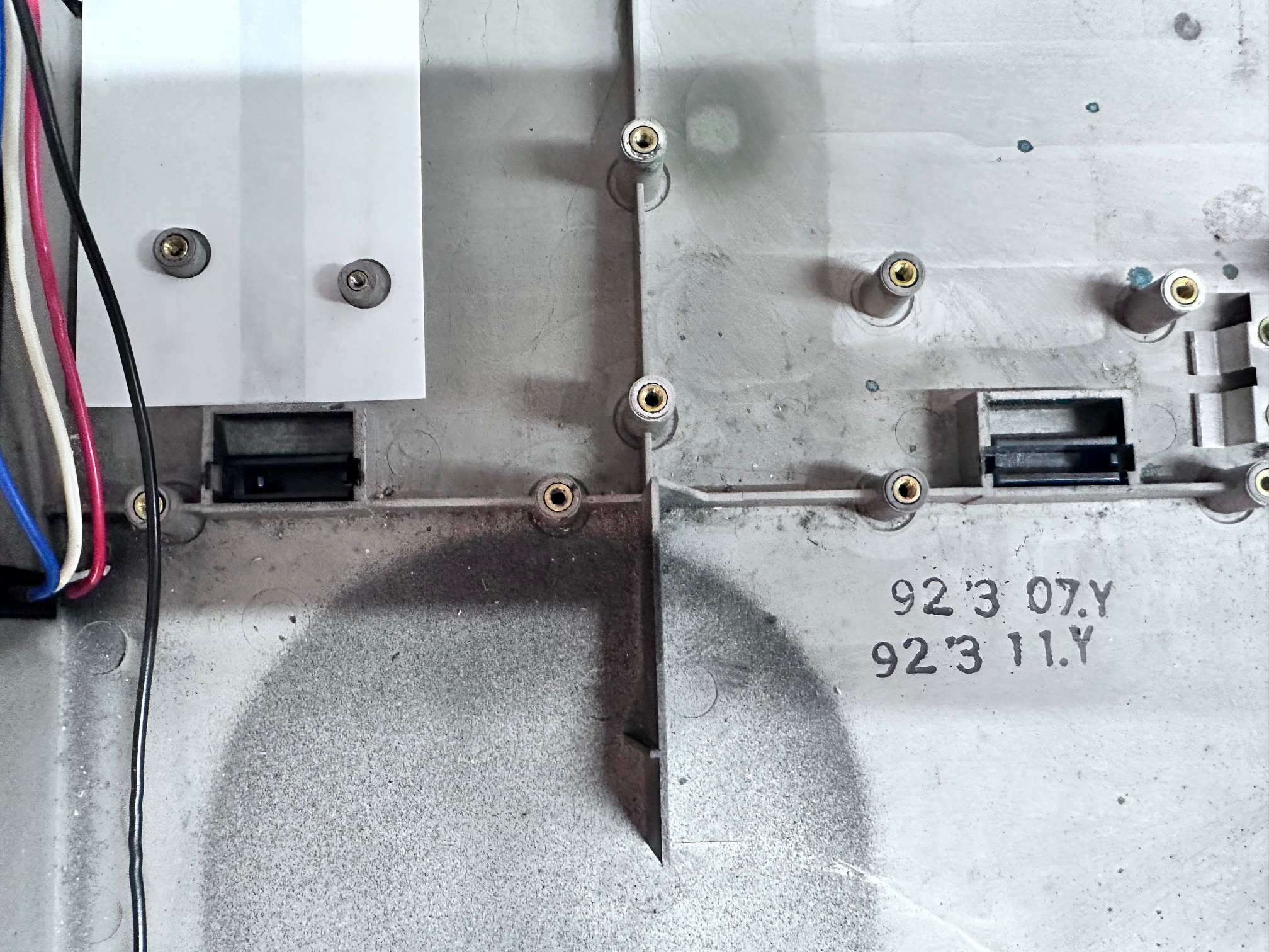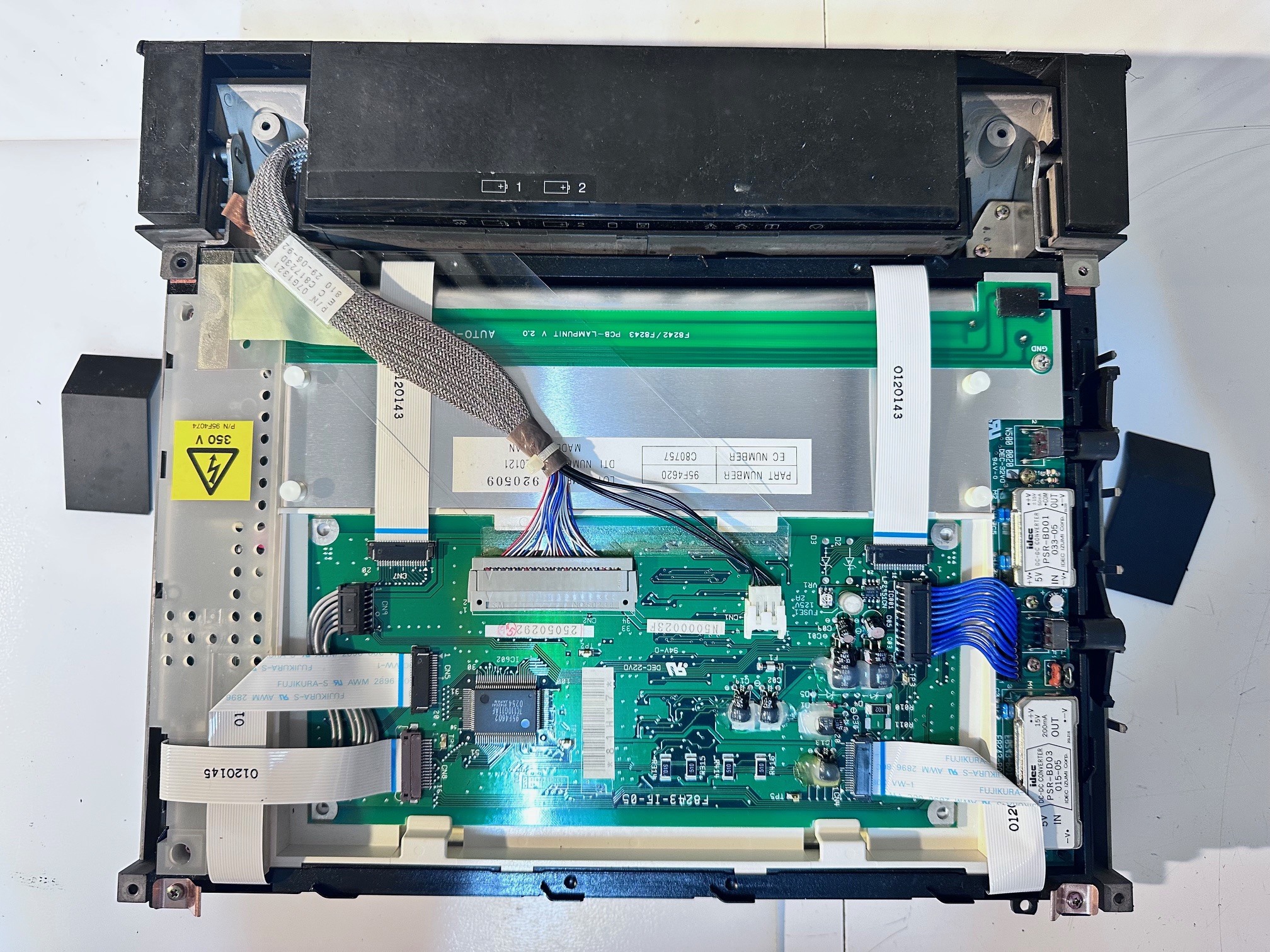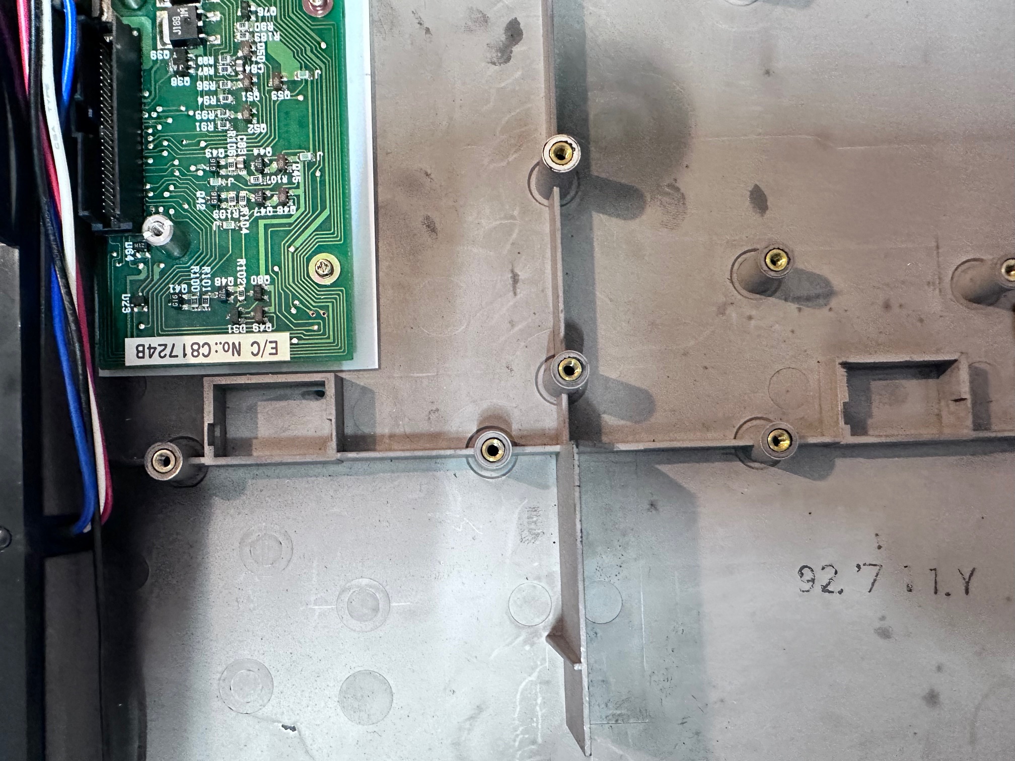 There are two power-related boards - this one at the very bottom has the power connector onboard and as you can see has a bunch of through-hole electrolytic caps to replace: