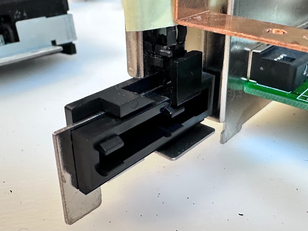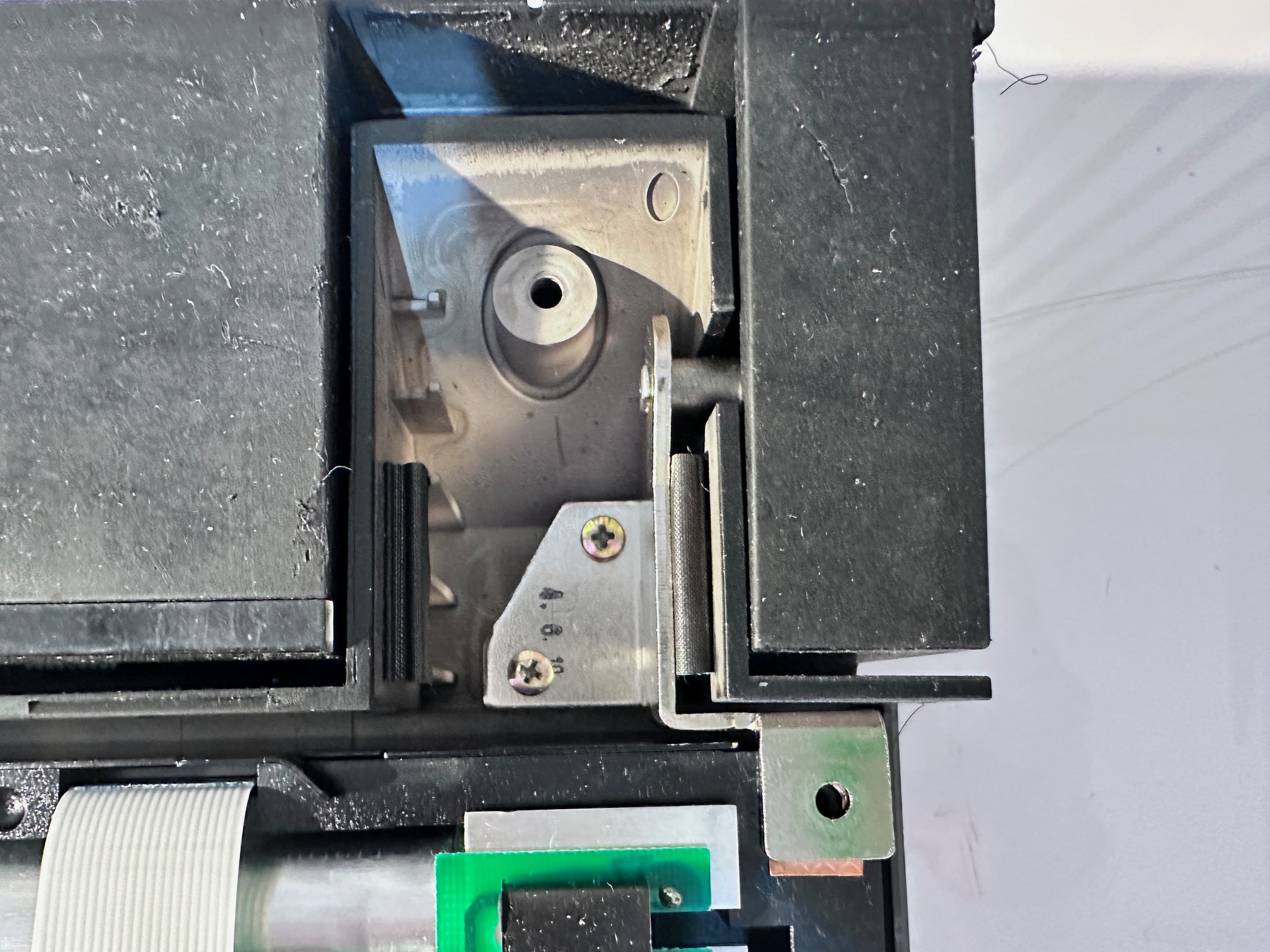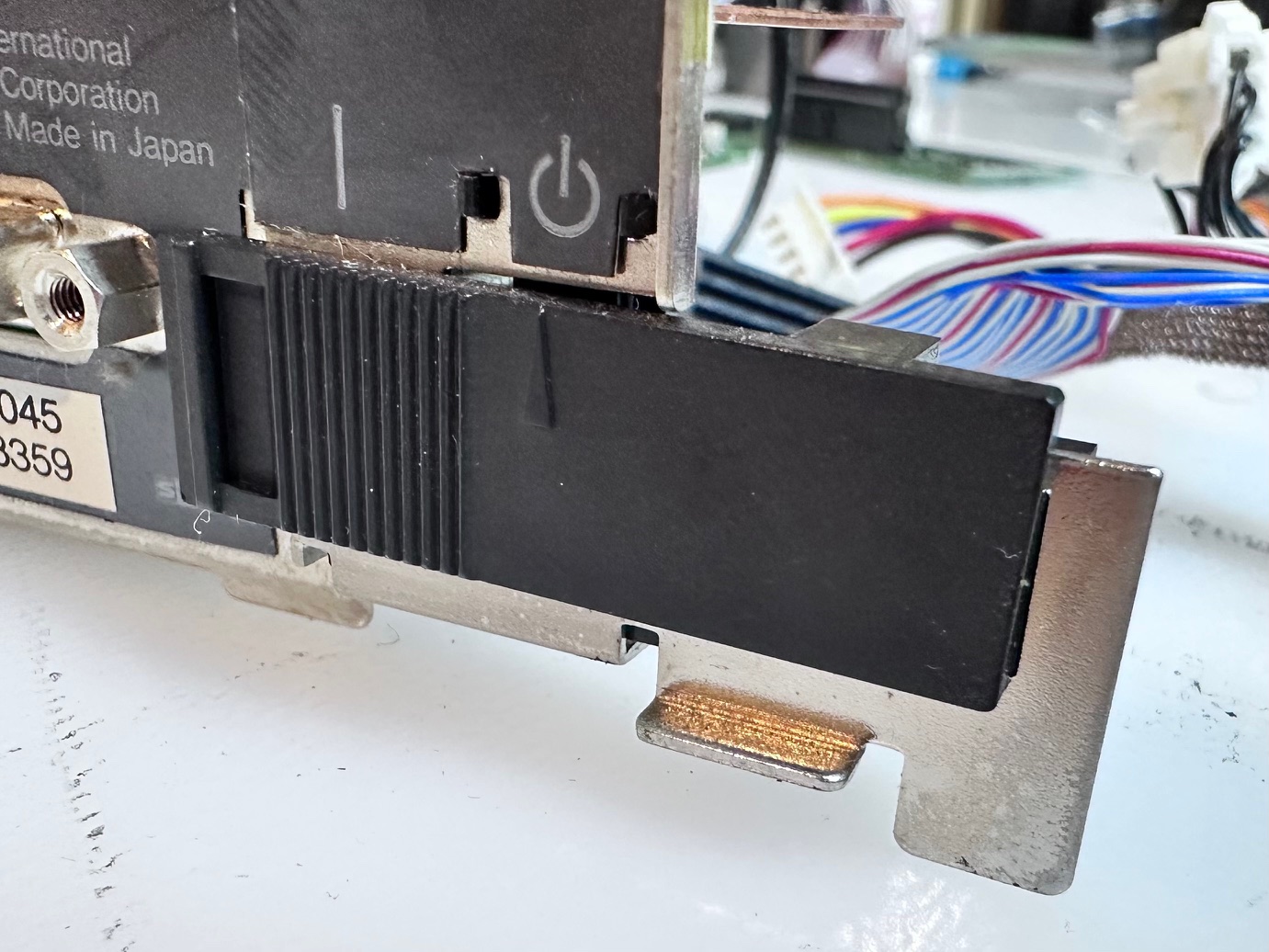 At the rear of the machine is a semi-hidden sliding, microswitched power switch used by the dock. It can easily be slid to the 'wrong' side meaning the machine will not power up - it will just blink some battery lights at you. Here is that switch shown in the HMM: