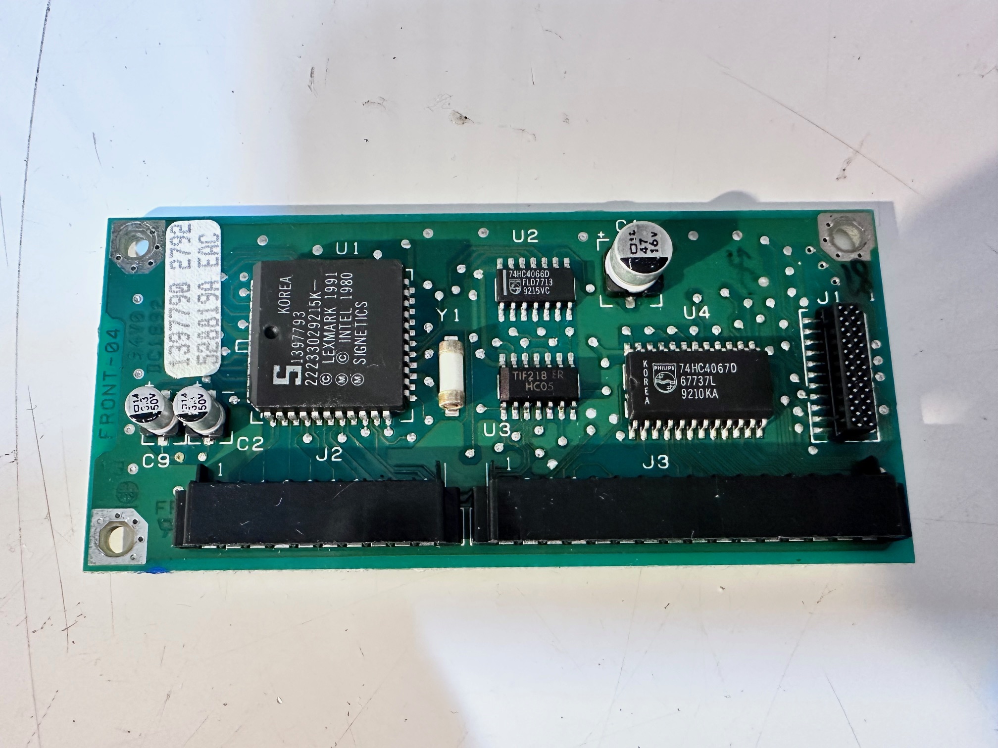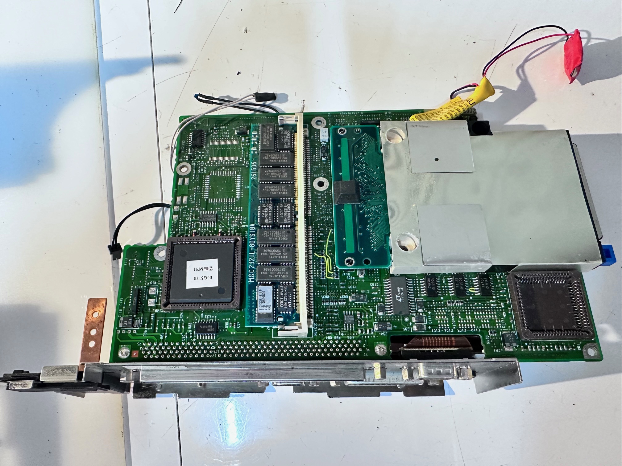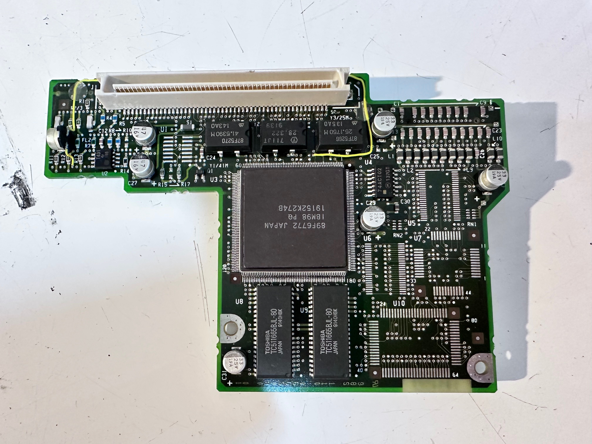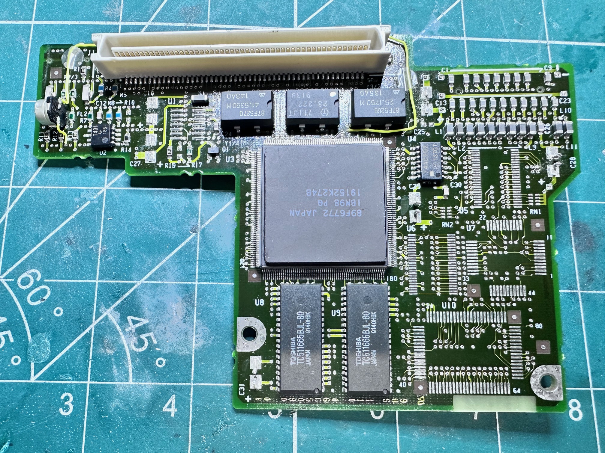 And the third board (working from the base up, is this board, which I think is related to CPU and some memory for maybe video or cache or something. This has 7 surface-mounted capacitors on it, and all of them leak and have failed. The one on the right is weirdly mounted on it's side....