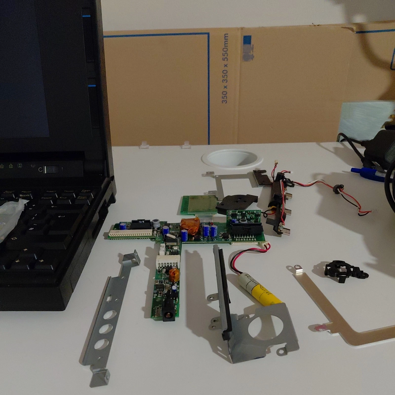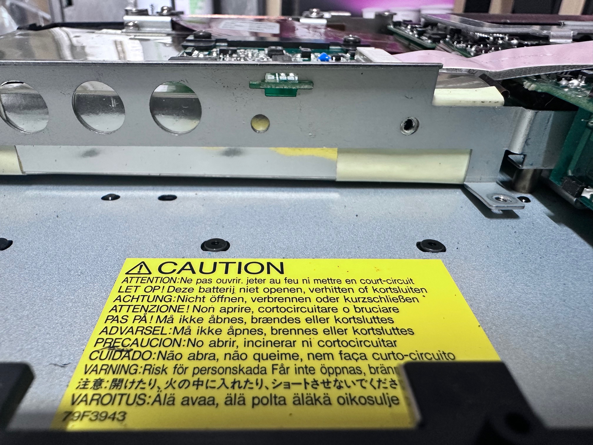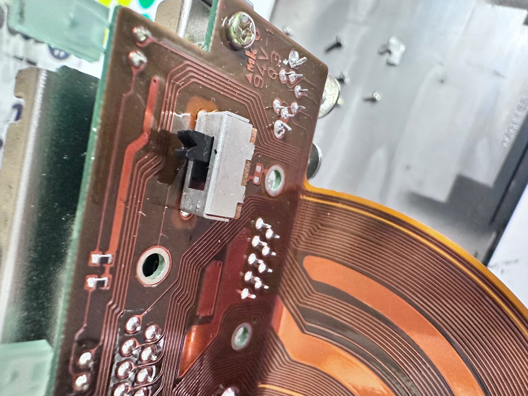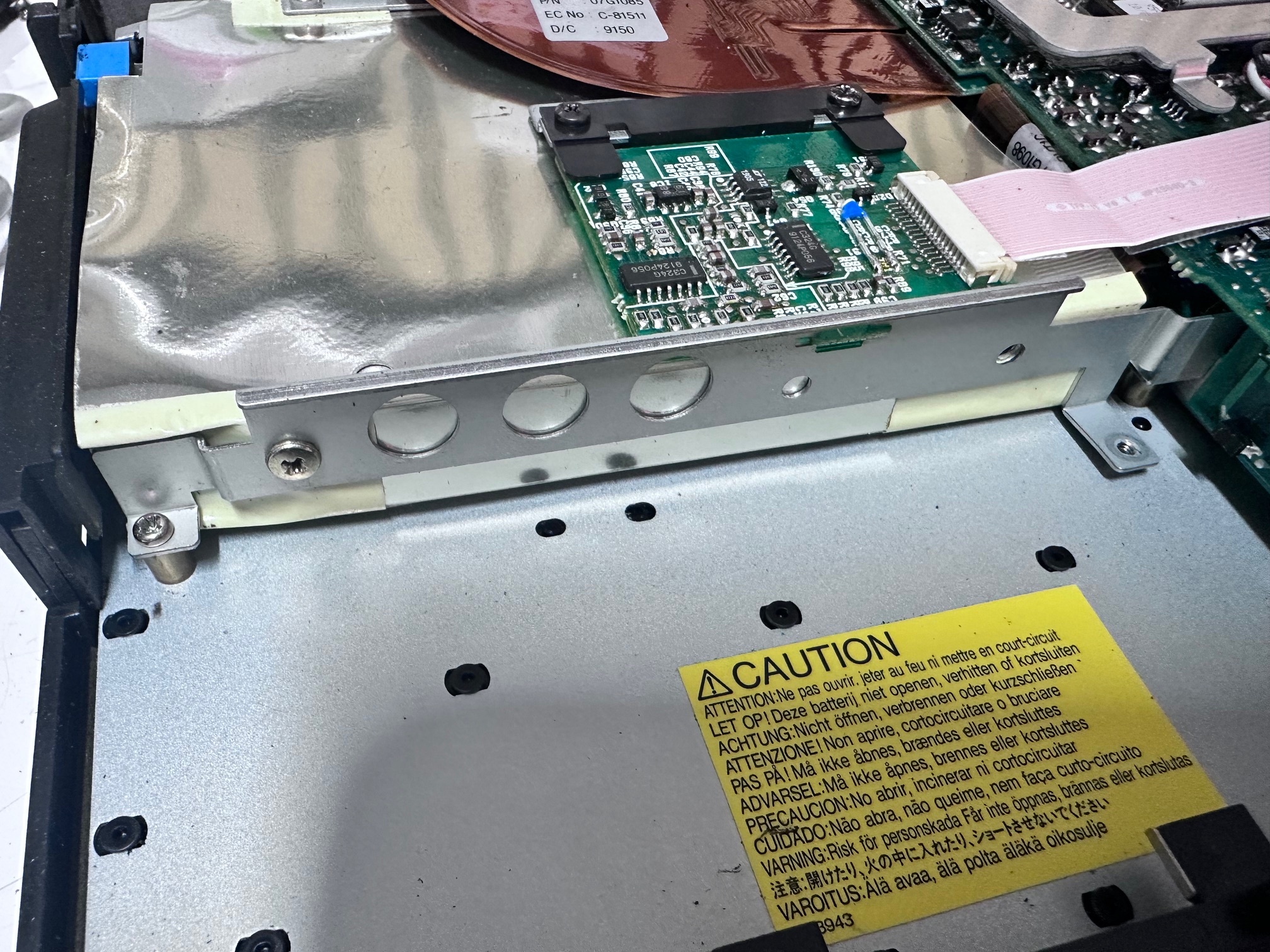 The LCD itself had around 7 small electrolytics around one end, which are only visible once you remove the aluminium frame. They're very hard to get to though, and to safely to do the job I'd have to desolder some very delicate ribbon cables, so I left them be. Most of the LCD panels seem to be fine and I've found it's a delicate gamble to desolder the single soldered ribbon which you need to remove to fold-over the PCB which has the capacitors mounted.