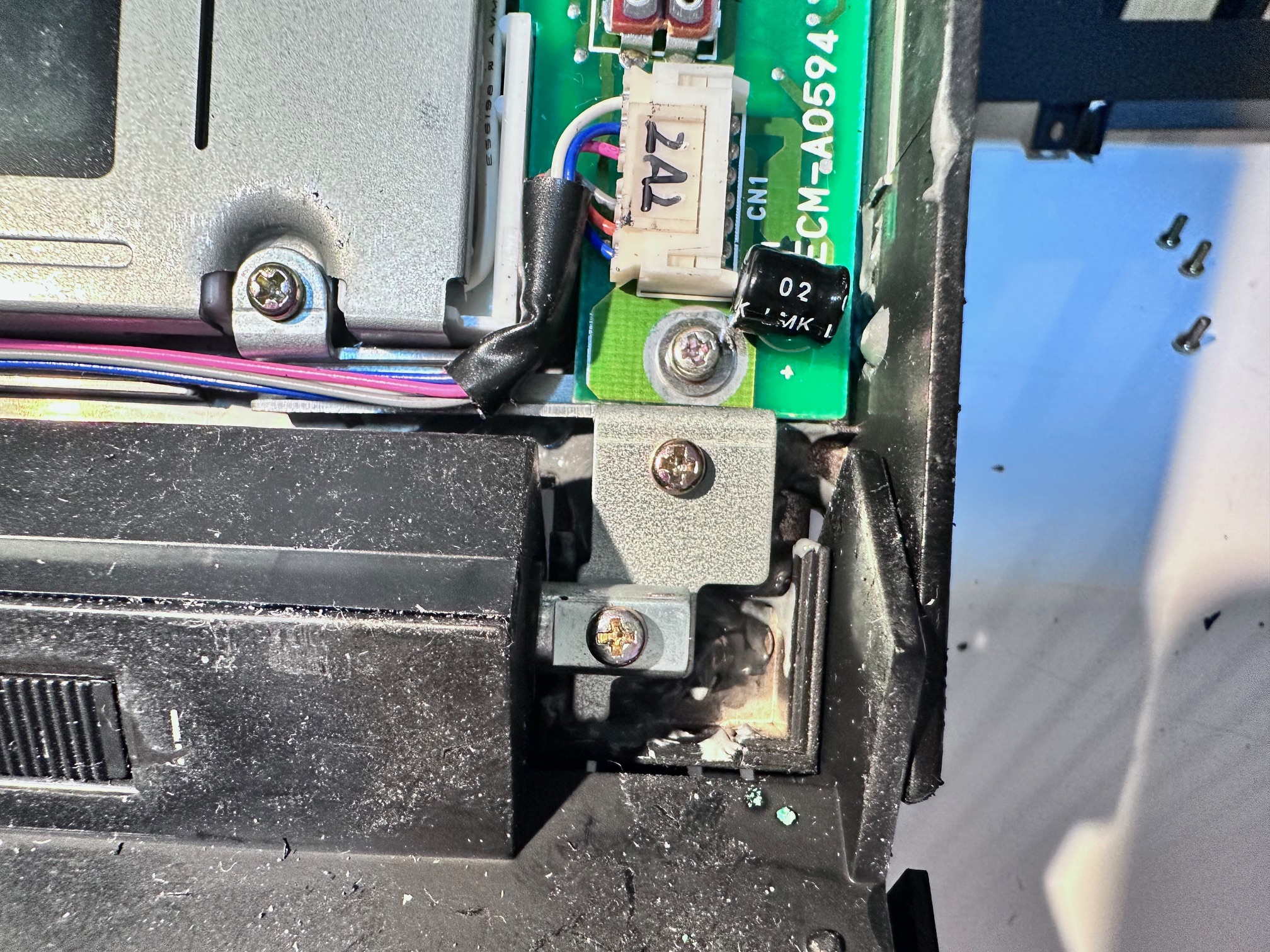 I was putting it back together and wondered to myself how the battery charges. I had not noticed it before but there are 3 very simple connections mounted within this plastic piece that holds the evil bridge/hibernation battery. You can see in the second picture, these metal connectors underneath: