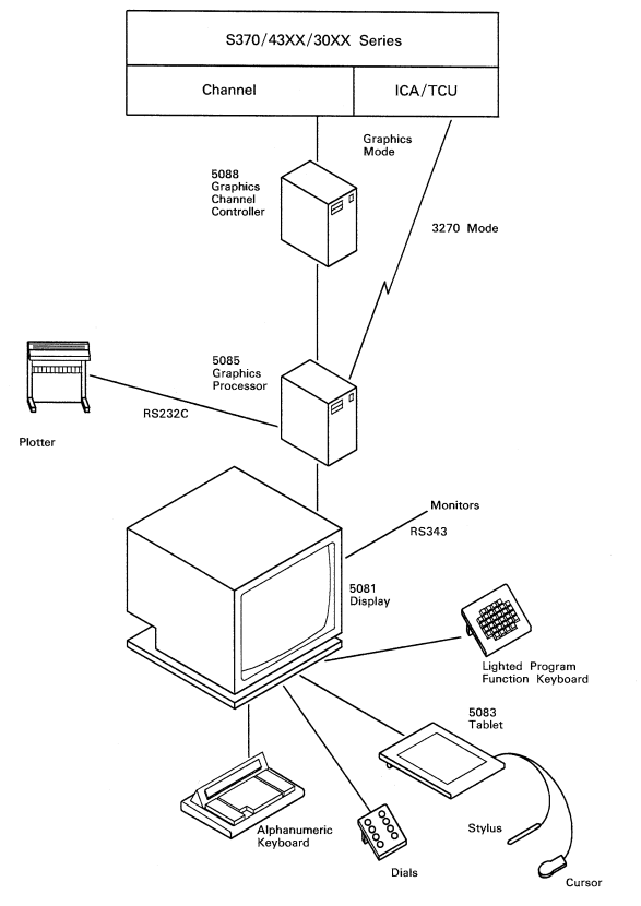 The 5080 was made up of the 5081 Display, the 5085 Graphics Processor Unit (which also handled 3270 control to the mainframe) and 5088 Graphic Channel Control Unit ('channel' from the mainframe). Obviously the mainframe itself did all the hard computing whilst turning those sums into graphics were handled by the 5085. Optional user-controlled extras were the lighted Programmable Function (PF) key unit, graphics tablet & puck, mouse, dials, light pen and plotter. This was highly specialised hardware and very expensive, in a world where computers barely had graphics and nobody knew what a GUI or a mouse was. These workstations predated the 1984 Apple Macintosh 128k and by far other GUIs like OS/2, Windows, Workbench or X Windows for Unix systems.