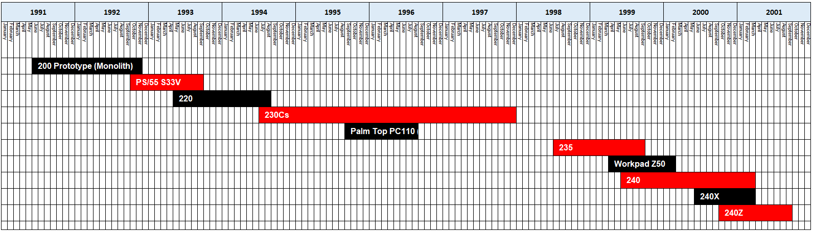 The series got off to a rocky start with the unreleased RIOS-designed 200, the rarely-spotted, Japan-only PS/55 S33V and the non-trackpoint RIOS-designed Japanese 220. None of these were really the full-Thinkpad package, but certainly informed the direction of travel for the series, showcasing good and bad ideas which ultimately enabled more wins than fails.. The rest were increasingly successful and increasingly acceptable as the miniature technology came of age.